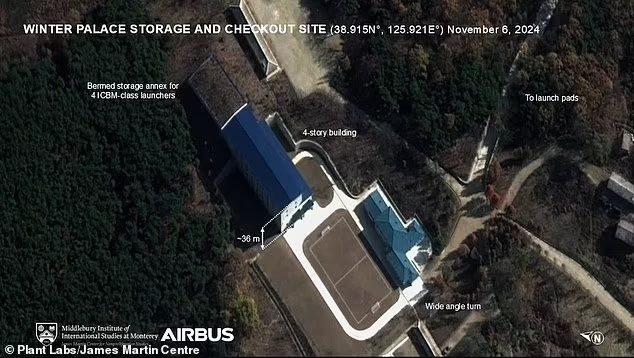 Дороги, которые недавно построили на территории, достаточно широкие для транспорта, который перемещает ракеты Hwasong-19. Эта ракета может пролететь 17 тысяч километров и поразить любые цели в США и Европе. В одном из новых зданий, которое имеет высоту 36 метров, вероятно, могут хранить ракеты в вертикальном положении. За этим сооружением есть еще одна, которую засыпали землей для большей защиты и маскировки.