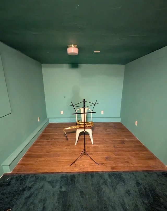 Мужчина открыл ее и оказался в необычной комнате с зелеными стенами. В конце помещения, что было три метра в ширину и восемнадцать метров в длину, стоял стул. На нем лежал старый саксофон, а рядом стоял пюпитр. Очевидно, в последний раз комнату использовали как музыкальную.