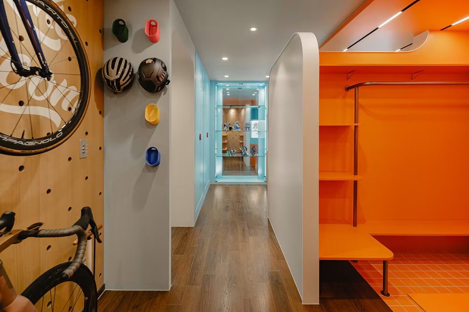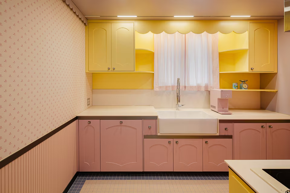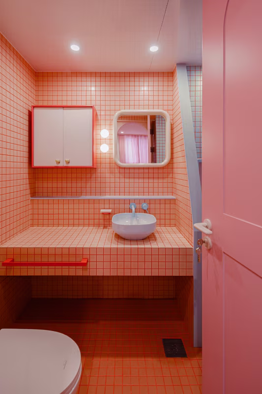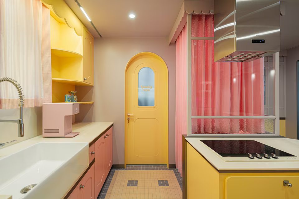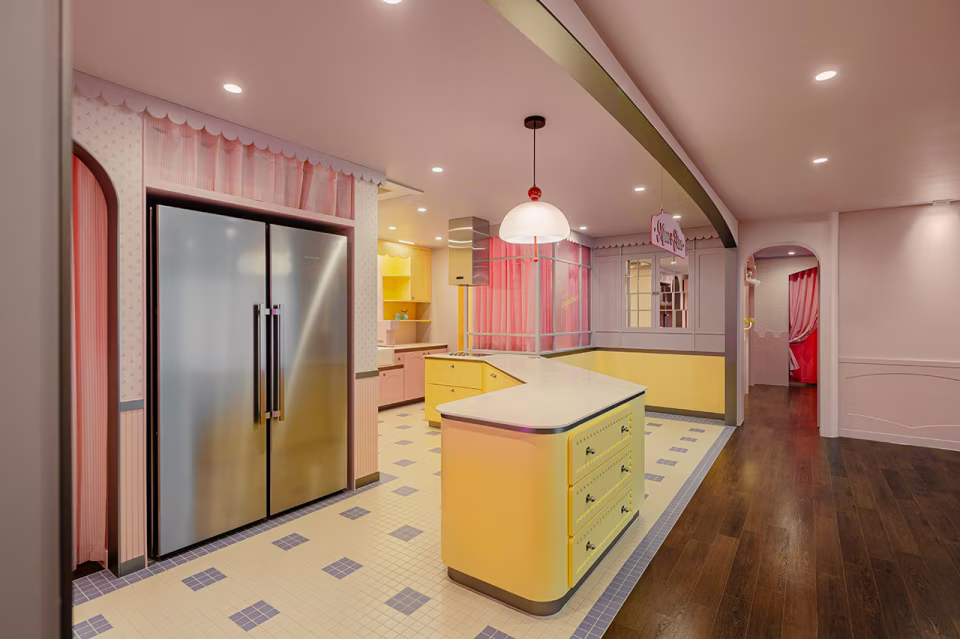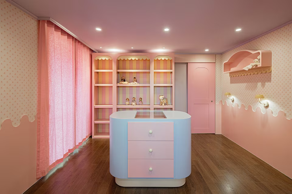 Как отмечают дизайнеры, здесь есть абсолютно все – от тревожных сцен из "Игры в кальмара" до конфетно-розовой стилистики Барби. Этот контраст работает именно благодаря сочетанию флуоресцентных цветов, волнистых декоративных панелей и обоев с почти игрушечными узорами.