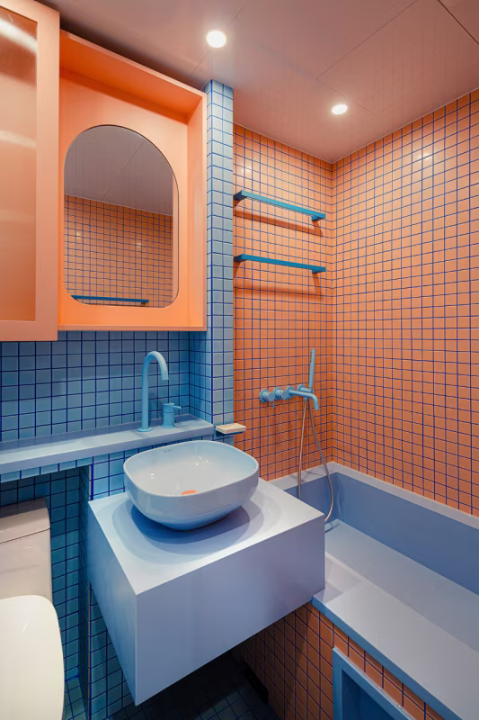 Разноцветная мебель и узоры добавляют уникальности помещению, создают динамичный и эксцентричный стиль. Две ванные комнаты выполнены в такой же стилистике.