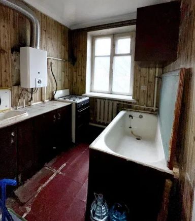 Вероятно, в квартире нет водоснабжения, поскольку на снимках не видно кранов. Зато на полу есть бутылки с водой. Особенностью квартиры является то, что ванная и кухня обустроены в одной комнате, а санузел – отдельно.