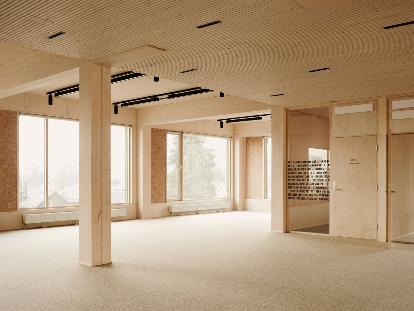 В здании столбы и балки из клееного бруса соединены с буковыми дюбелями, а стены и плиты CLT закреплены с помощью специальных соединителей X-fix. Это дало возможность избежать использования стали и алюминия для соединений.