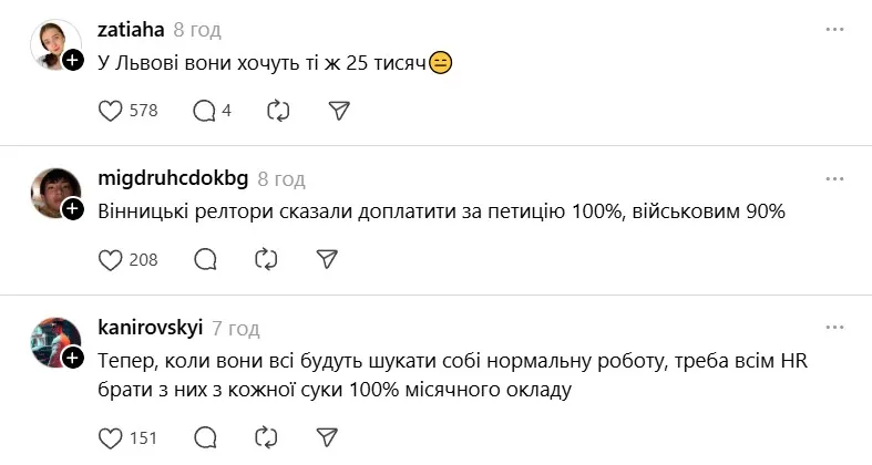 - "Наконец общество решило взять за нахлебников (риэлторов). Все больше и больше вижу об этом постов. Также петиция собрала нужное количество голосов и находится на рассмотрении".