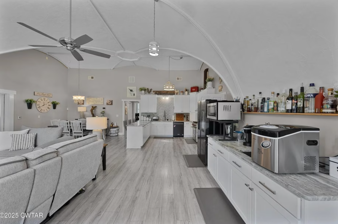 Но, как и в книгах Толкина, не стоит судить об этом доме только по внешнему виду в стиле бункера и фасад, вдохновленный Хоббитом. Ведь внутри – настоящее чудо современного дизайна. Текущие владельцы полностью обновили пространство: открытый план, гранитные столешницы, пол из роскошной виниловой доски – все продумано до мелочей.