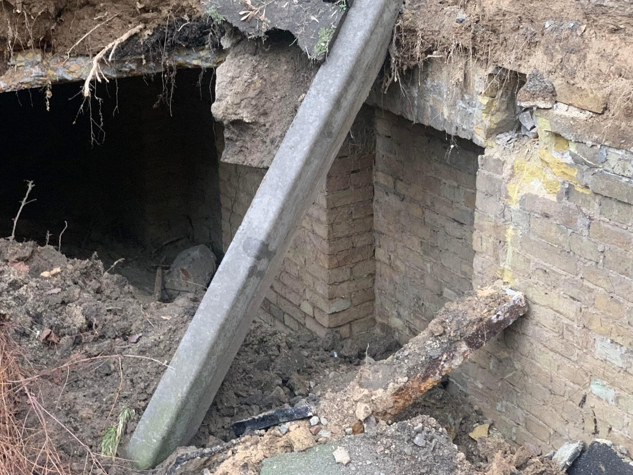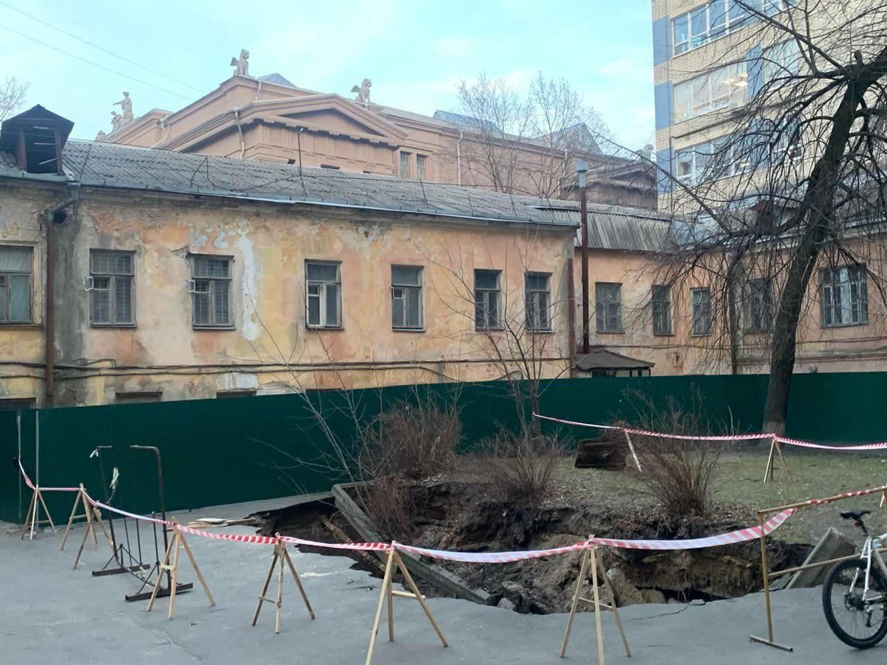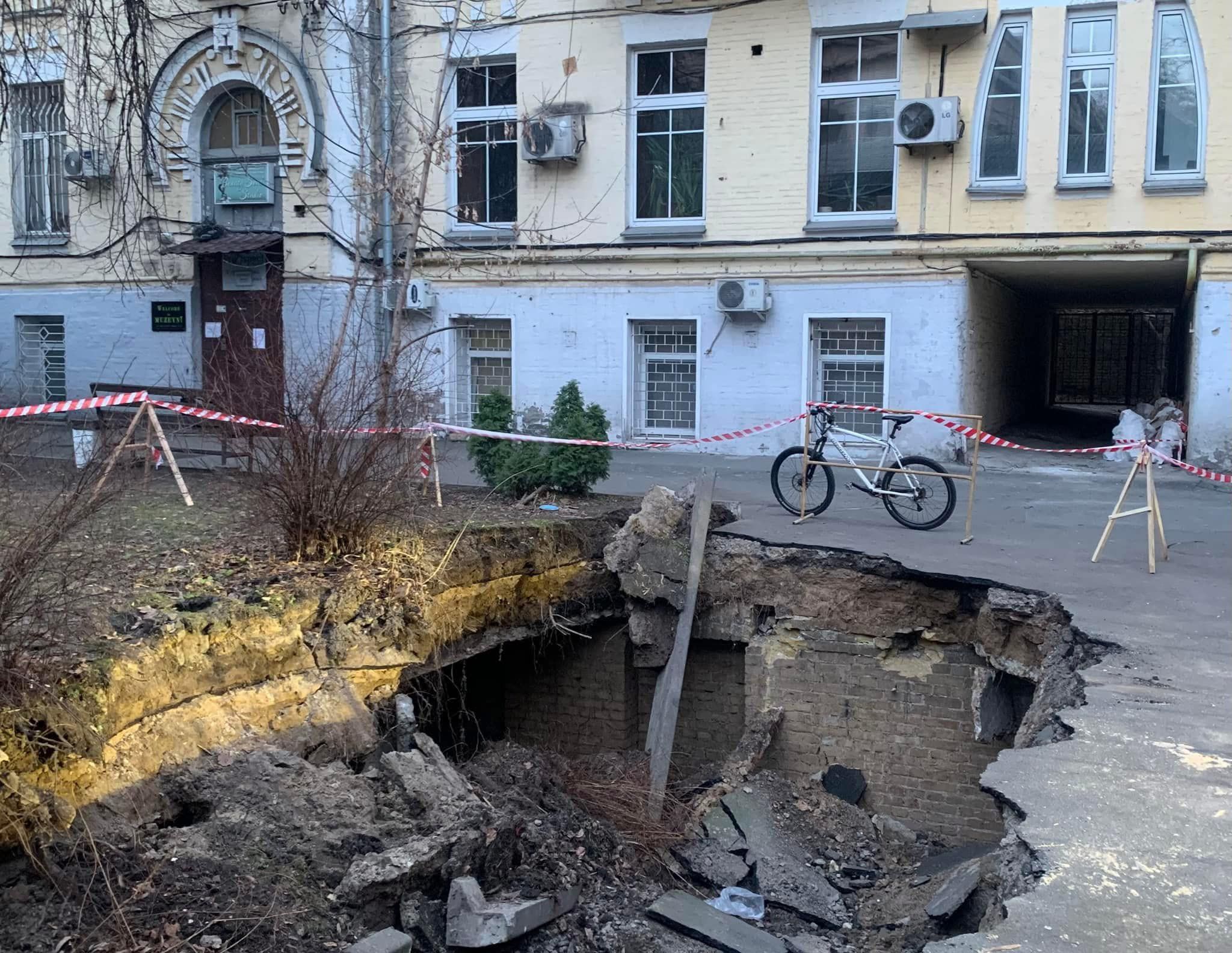 В одном из дворов Печерского района Киева 8 марта образовалась воронка, в которой оказались 3 автомобиля. Машины из пропасти пришлось доставать коммунальщикам. После того, как их убрали, под слоем земли в 50 – 60 сантиметров обнаружили перекрытие, каменную стену из киевского желтого кирпича и нишу с лучковой перемычкой.