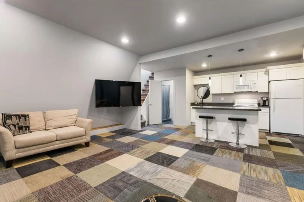 Первые несколько комнат не имеют мебели и соединены тоннелем. Однако гостиная и кухня объединены в одну просторную зону. Внутри есть две спальни с ковровым покрытием, телевизорами и двуспальной кроватью. В квартире также есть стиральная машина, духовка и холодильник, комната с туалетом и душем, в которую есть вход из спальни.