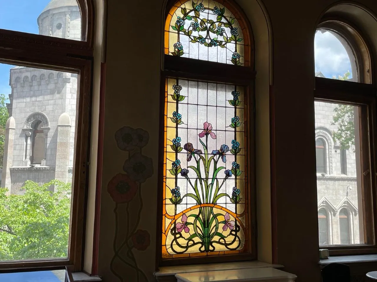 Зал в стиле модерн, по правилам тогдашнего этикета, был предназначен для отдыха женщин. Уникальным элементом декора там были аутентичные витражи с ирисами, сохранившиеся по сей день.