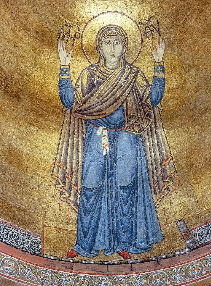 Главный алтарь Софии Киевской венчает невероятной красоты шестиметровый образ Богоматери Оранты (изображение Девы Марии в молитве с вытянутыми руками). Чтобы выложить его, использовали 2 миллиона кусочков цветной смальты.