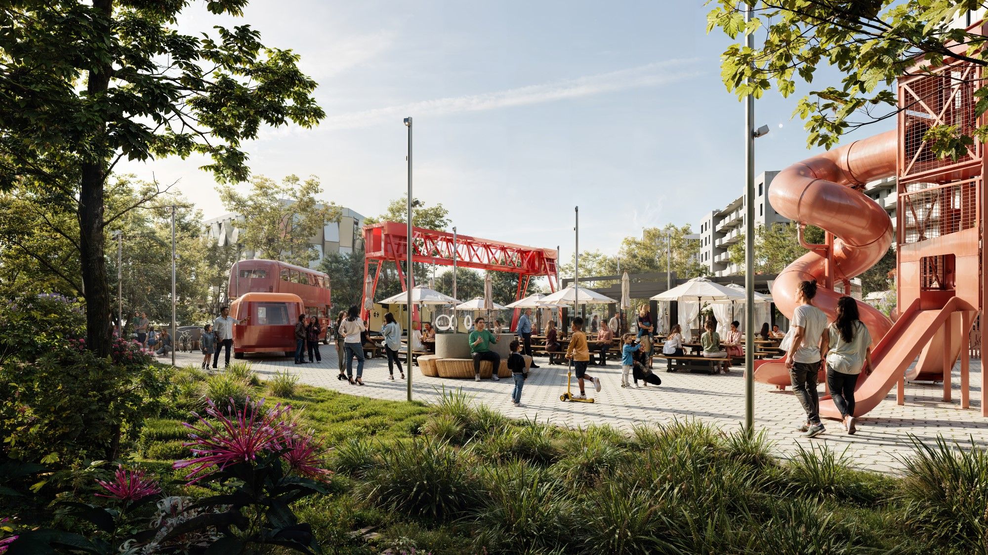 Инфраструктуру ЖК будут формировать фудкорты, кафе, открытые киносеансы и сцена для событий, а также коворкинг, библиотека и арт-пространства для творчества, а еще зоны для йоги, медитаций и релакса. Также на территории будет собственный детский сад, пространство для выгула собак, корты для падл-тенниса, детские площадки, фонтанчики, спортивные и игровые зоны.