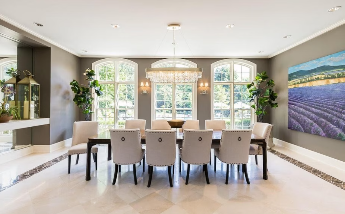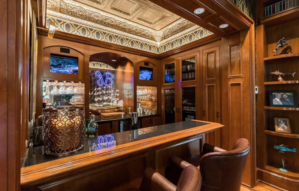 Имение с шестью спальнями и шестью ванными комнатами стоит за воротами, ведущими к эффектному круговому подъезду. Внутри – настоящая мечта для любителей принимать гостей: кухня для шеф-повара, парадная столовая, медиа-зал, винный погреб и бар.