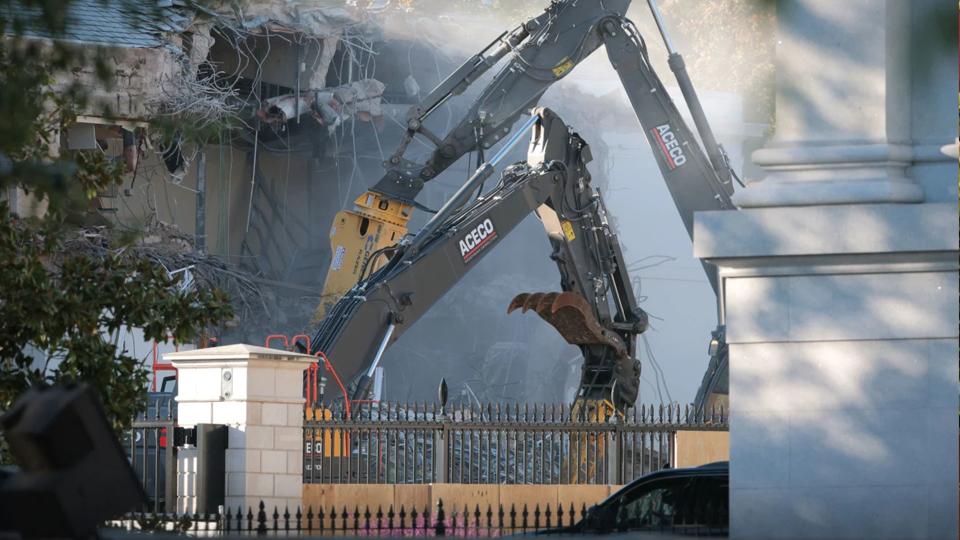 Восточное крыло президентской резиденции – здание, где должен размещаться офис первой леди, – полностью снесено. На месте бывшей постройки видно кучи обломков, а рядом работает экскаватор, который уплотняет грунт для вывоза остатков конструкции.