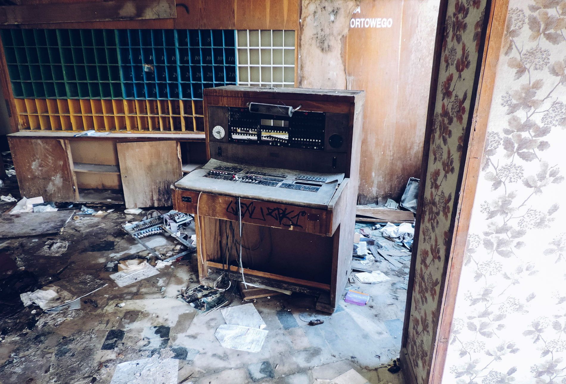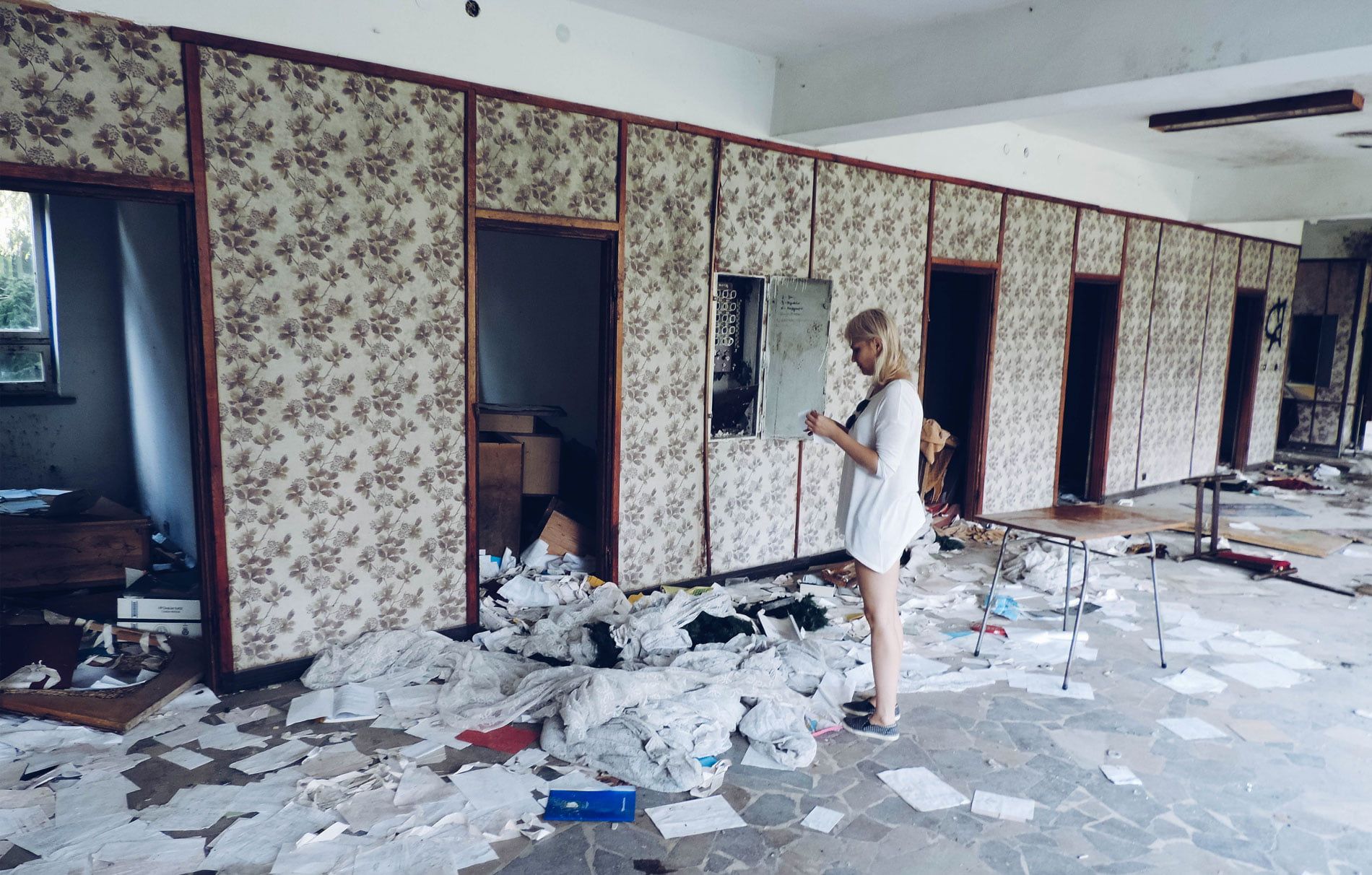 В некоторых номерах на окнах еще висят старые тюли, на стенах до сих пор есть красочные обои, стоят поломанные кровати и тумбочки. На рецепции все еще можно найти телефоны. А на столах разбросаны записки, счета, книги.