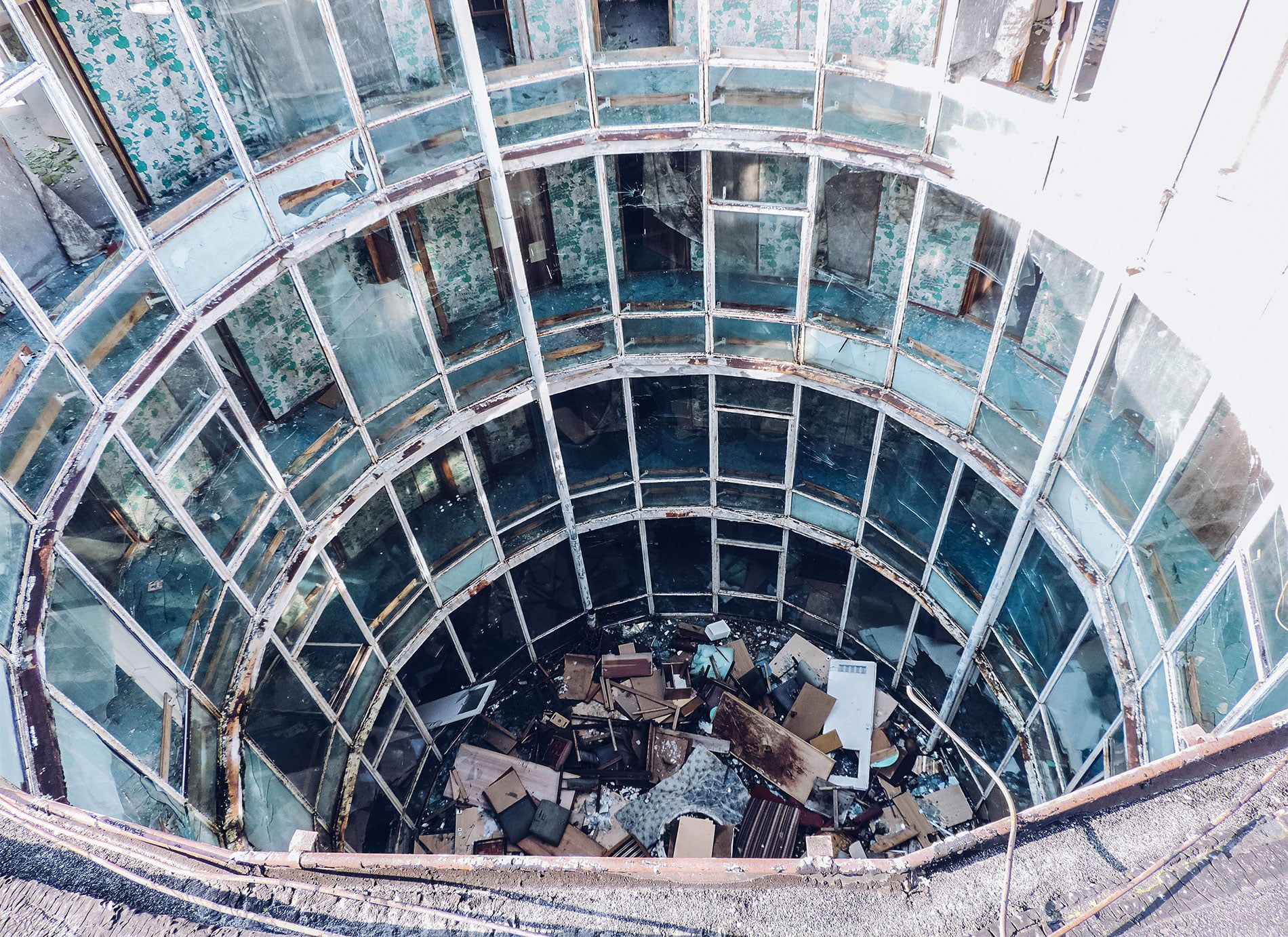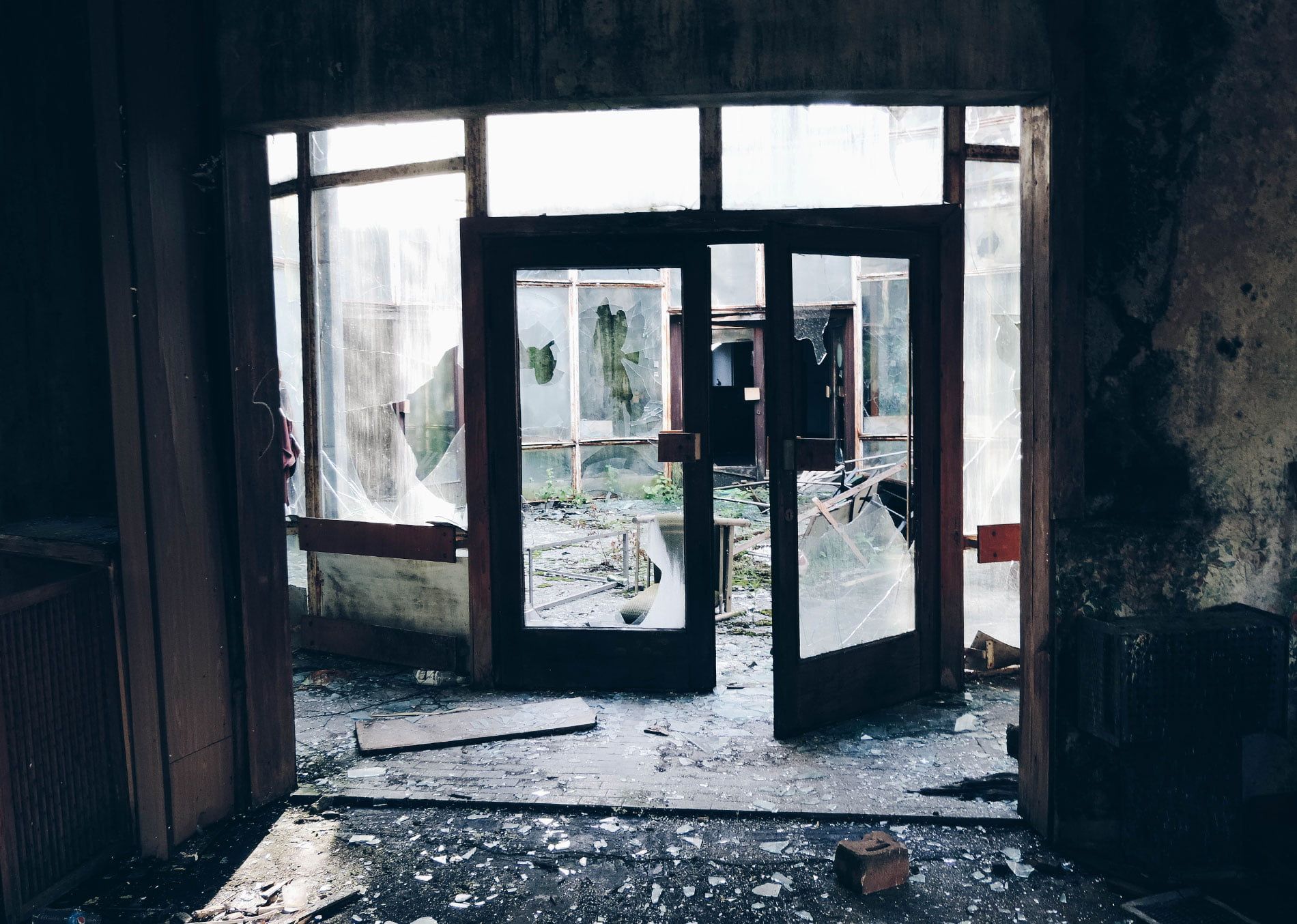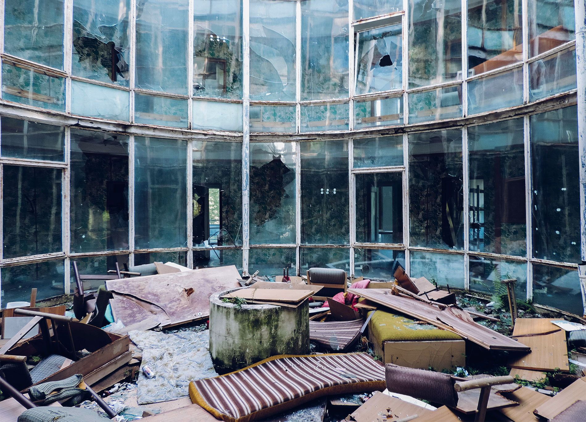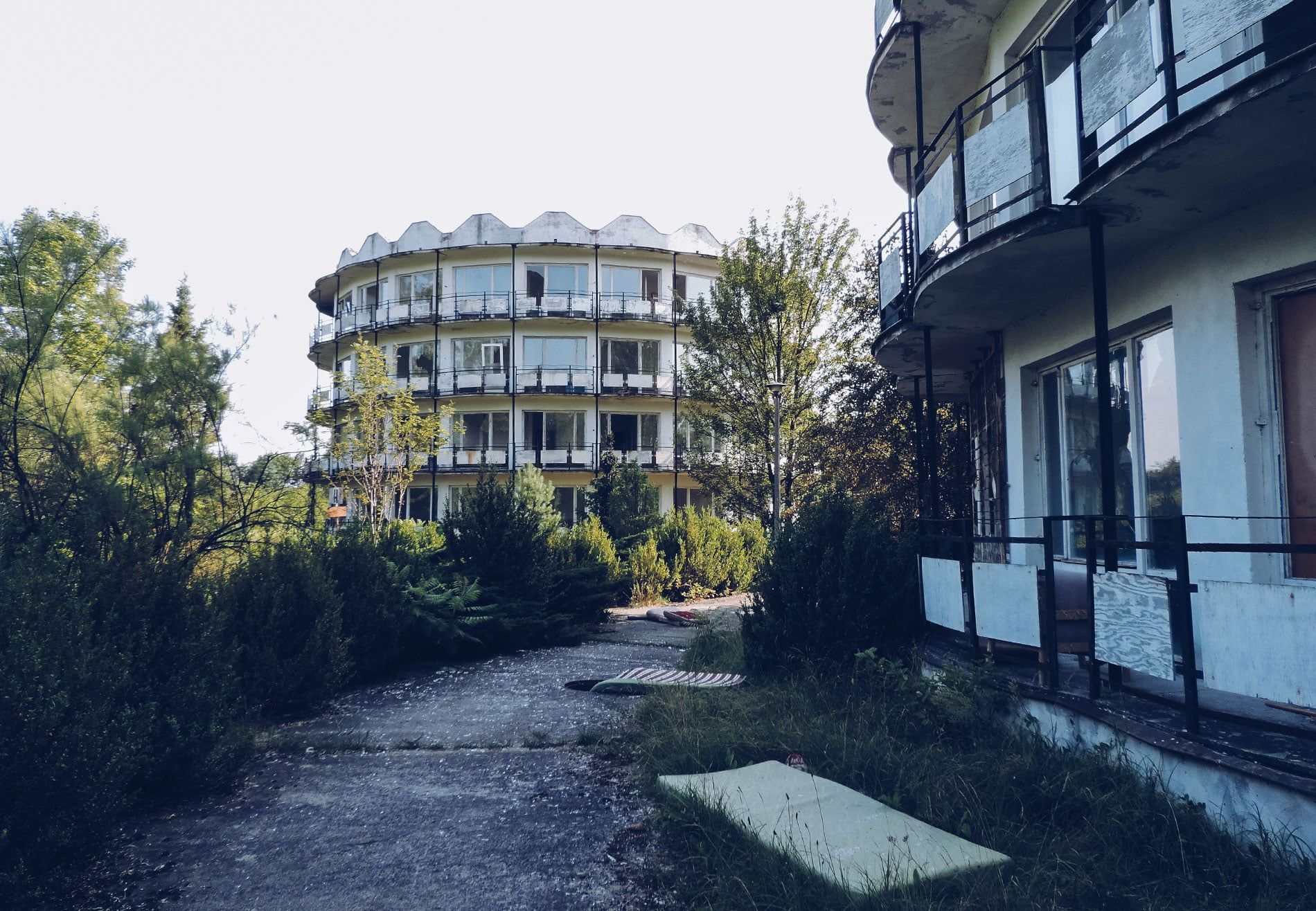 Сейчас это полностью заброшенные здания с разбитыми окнами, поврежденной мебелью и пышной растительностью, которая распространилась на все внутреннее пространство.