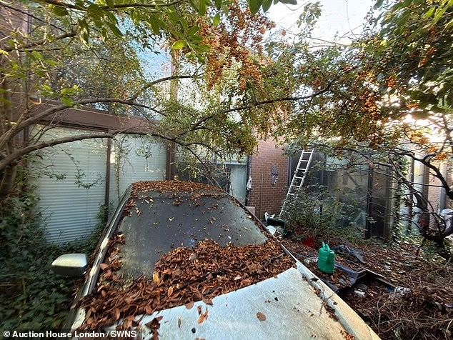 На фото видно, что помещения полностью завалены мусором, фасад зарос густой растительностью, а на подъездной дорожке годами стоит брошенный автомобиль, покрытый опавшими листьями.