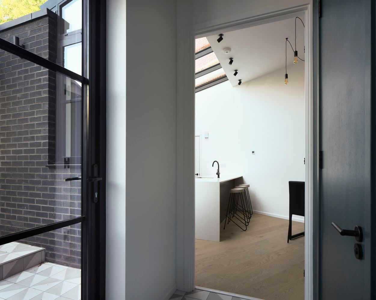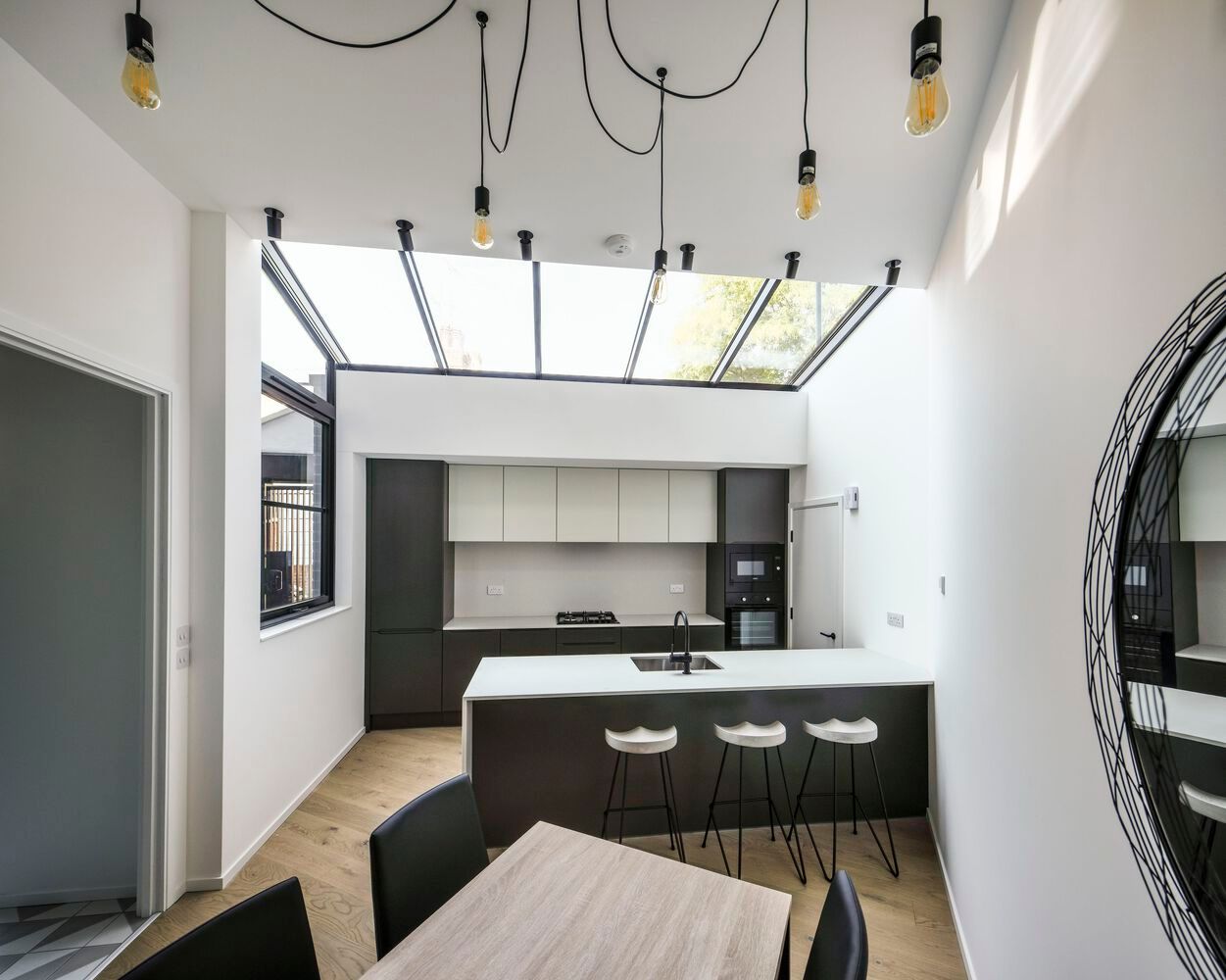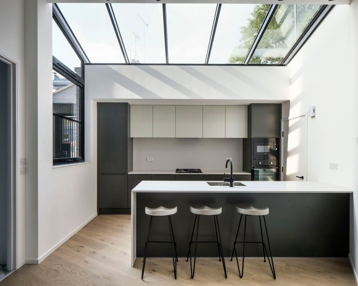 Здание является частью близлежащих сооружений и имеет с ними общие боковые стены. Поэтому одной из важных задач проекта было обеспечить достаточное количество естественного света. В доме оставили огромные окна, добавили стеклянные входные двери, а также обустроить стеклянную крышу в зоне кухни на первом этаже, а также и мансардное окно.