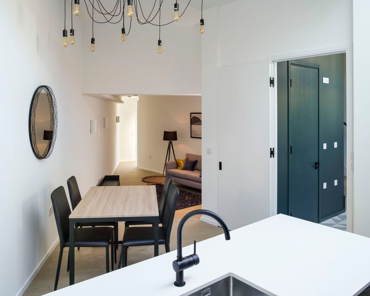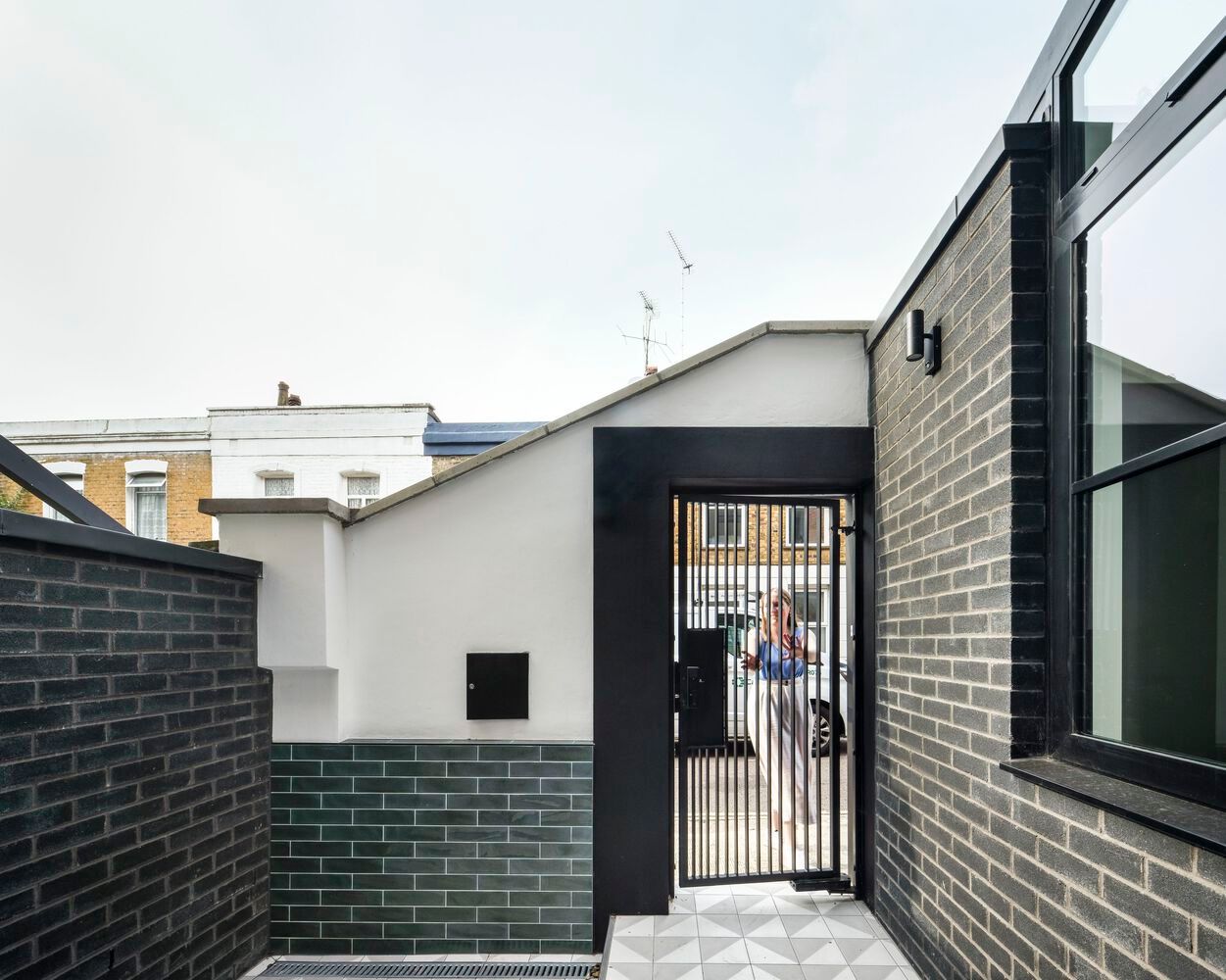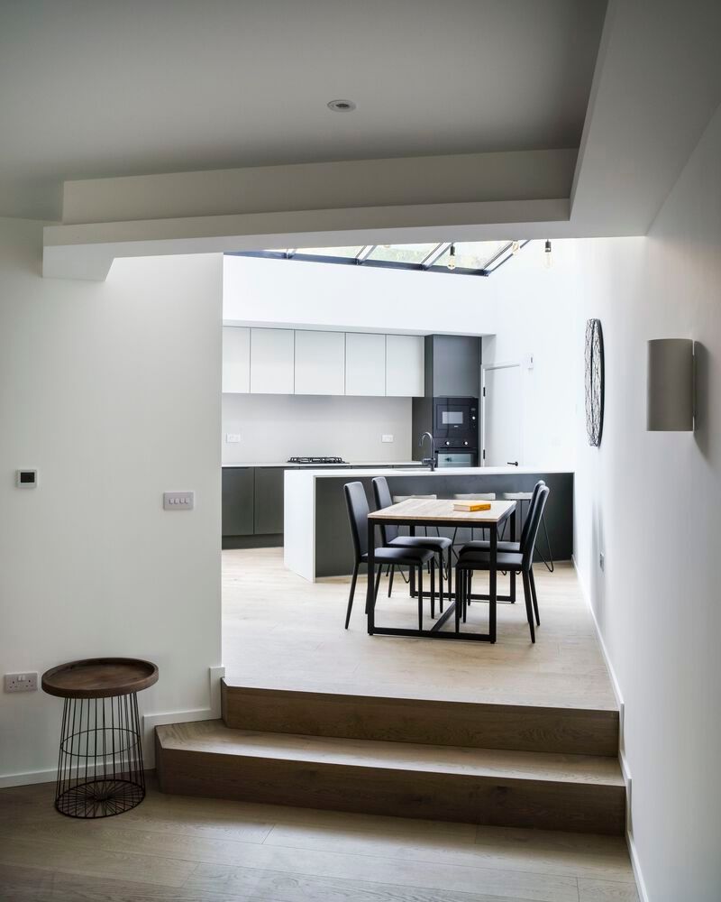 Здание является частью близлежащих сооружений и имеет с ними общие боковые стены. Поэтому одной из важных задач проекта было обеспечить достаточное количество естественного света. В доме оставили огромные окна, добавили стеклянные входные двери, а также обустроить стеклянную крышу в зоне кухни на первом этаже, а также и мансардное окно.