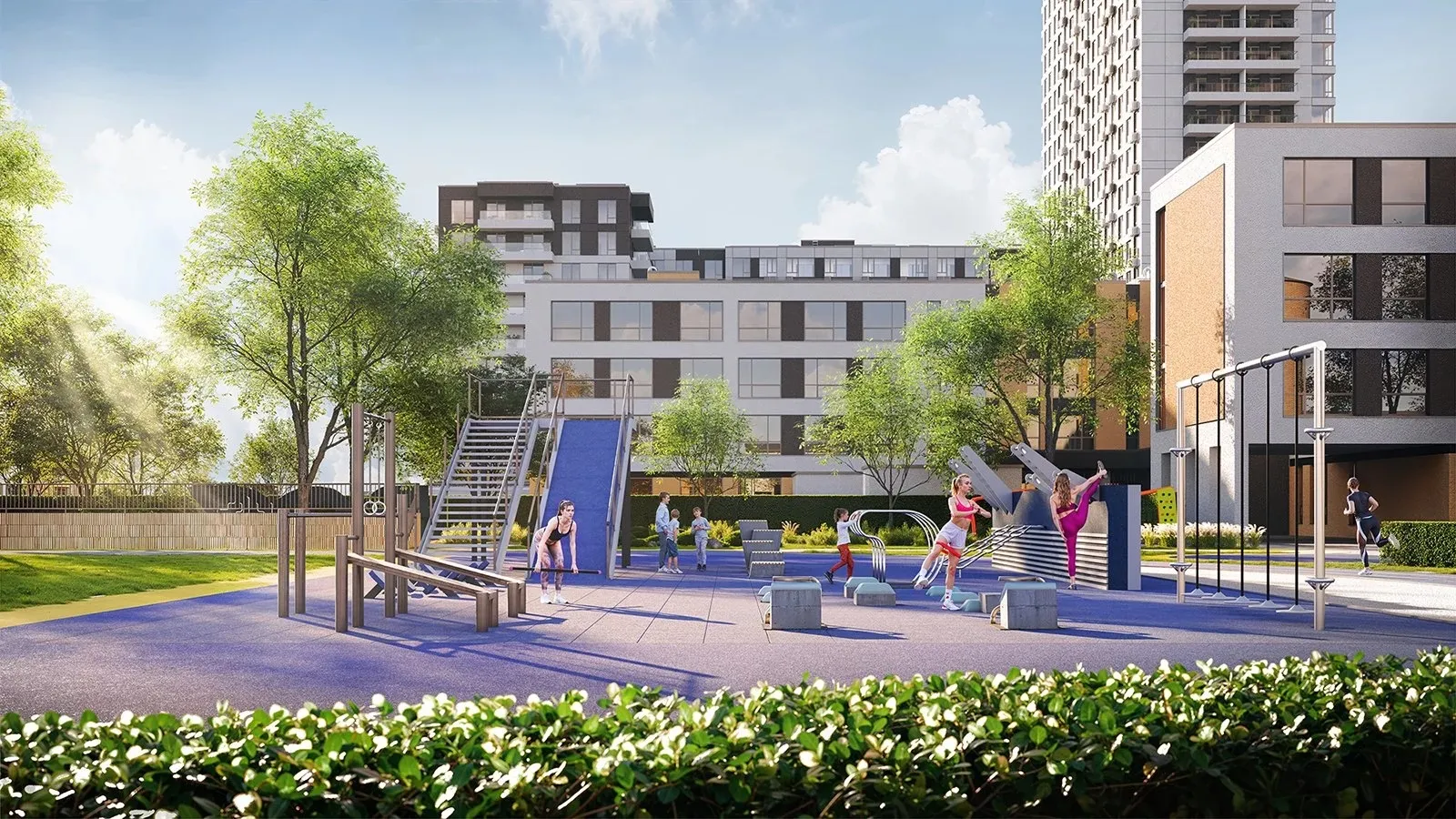 В спортивной зоне предусмотрена универсальная спортплощадка (баскетбол, волейбол, минифутбол), отдельное футбольное поле, беговую дорожку на 250 метров и трибуны. Также здесь будут тренажеры и зона TRX.