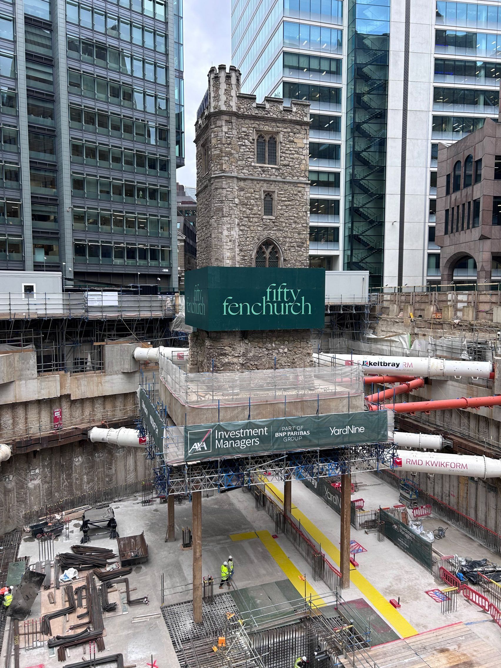 Під час масштабних земляних робіт на Фенчерч-стріт, 50 у лондонському Сіті 700-річну церковну вежу тимчасово підняли над будівельним майданчиком. До цього вдалися через те, що там зводяться новий хмарочос.
