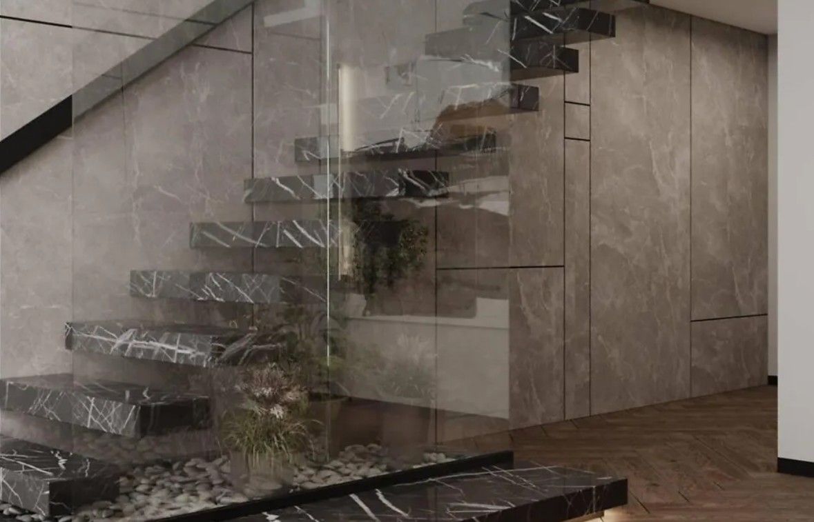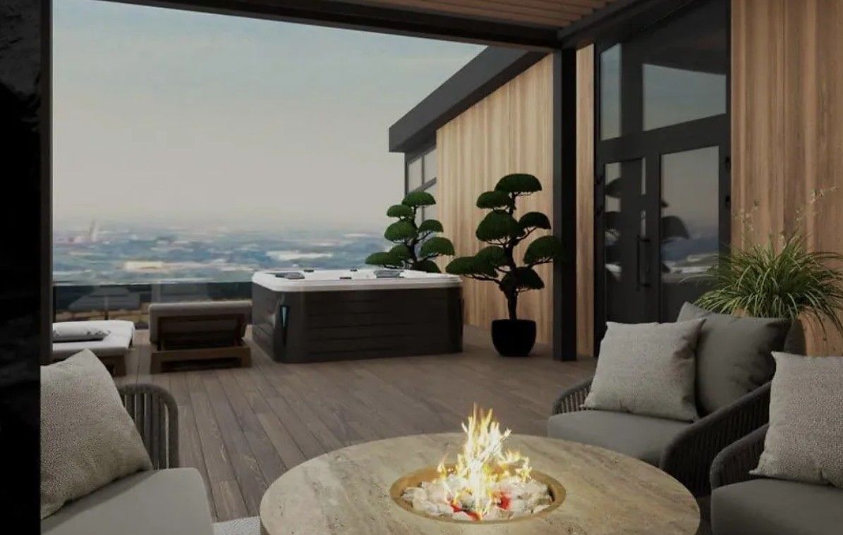 На терасі є накриття із підсвіткою, яке автоматично відкривається. Також там встановлене джакузі, яке функціонує взимку, зона відпочинку зі столом, аудіосистема, винний холодильник.