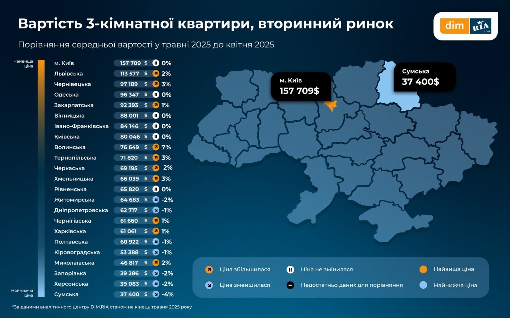 Це найбільший показник у цьому сегменті житла по Україні. Тепер трикімнатні квартири коштують у середньому 76,6 тисячі доларів. Однак це не вплинуло на загальну картину вартості житла. У Львівській, Чернівецькій, Закарпатській та Івано-Франківській областях ціни на трикімнатне житло однаково вищі.