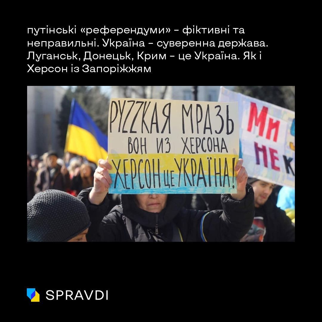 Крім того, росіяни, за даними спецслужб, хочуть анексувати не лише 4 області, в яких проводять фейкові голосування, але й окуповану частину Миколаївщини. Однак там не все так просто – мешканці міста Снігурівка вийшли на мітинг проти псевдореферендуму, заявивши, що місто є частиною України.