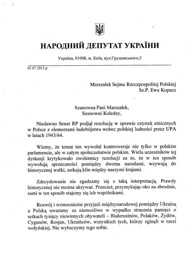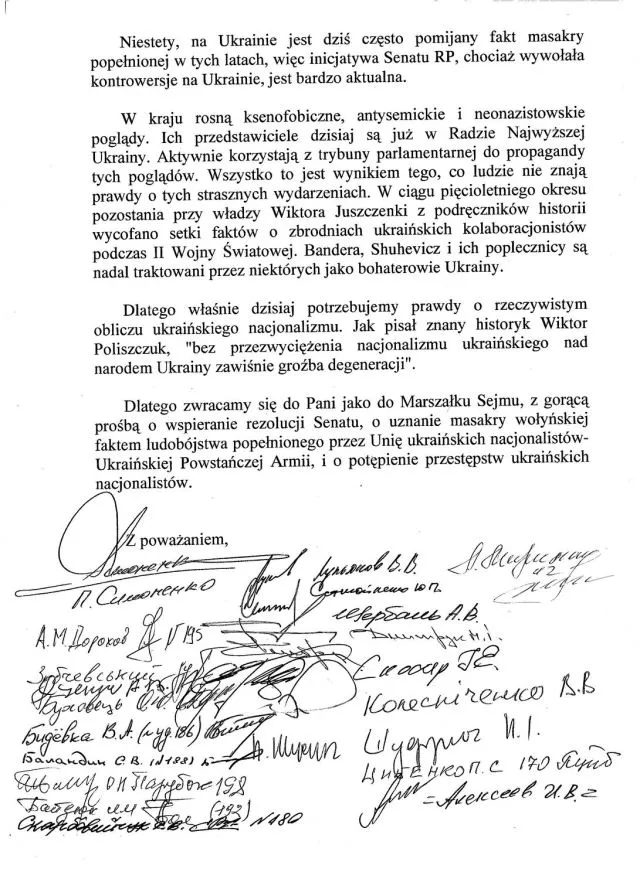 "Просимо вас, депутатів Сейму Республіки Польща, підтримати рішення сенату, визнати Волинську різанину ОУН-УПА геноцидом щодо польського населення і засудити злочинні діяння українських націоналістів", – йде мова у зверненні нардепів ВР до депутатів Сейму і маршала Еви Копач.