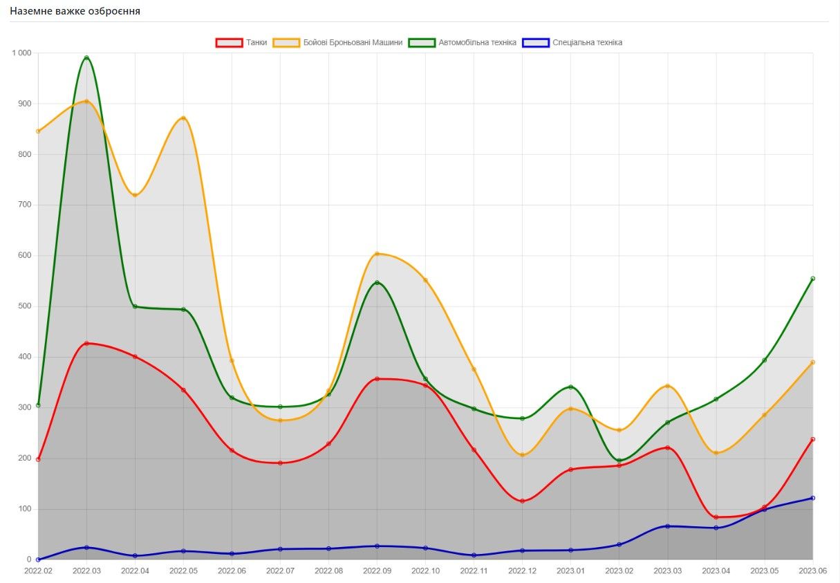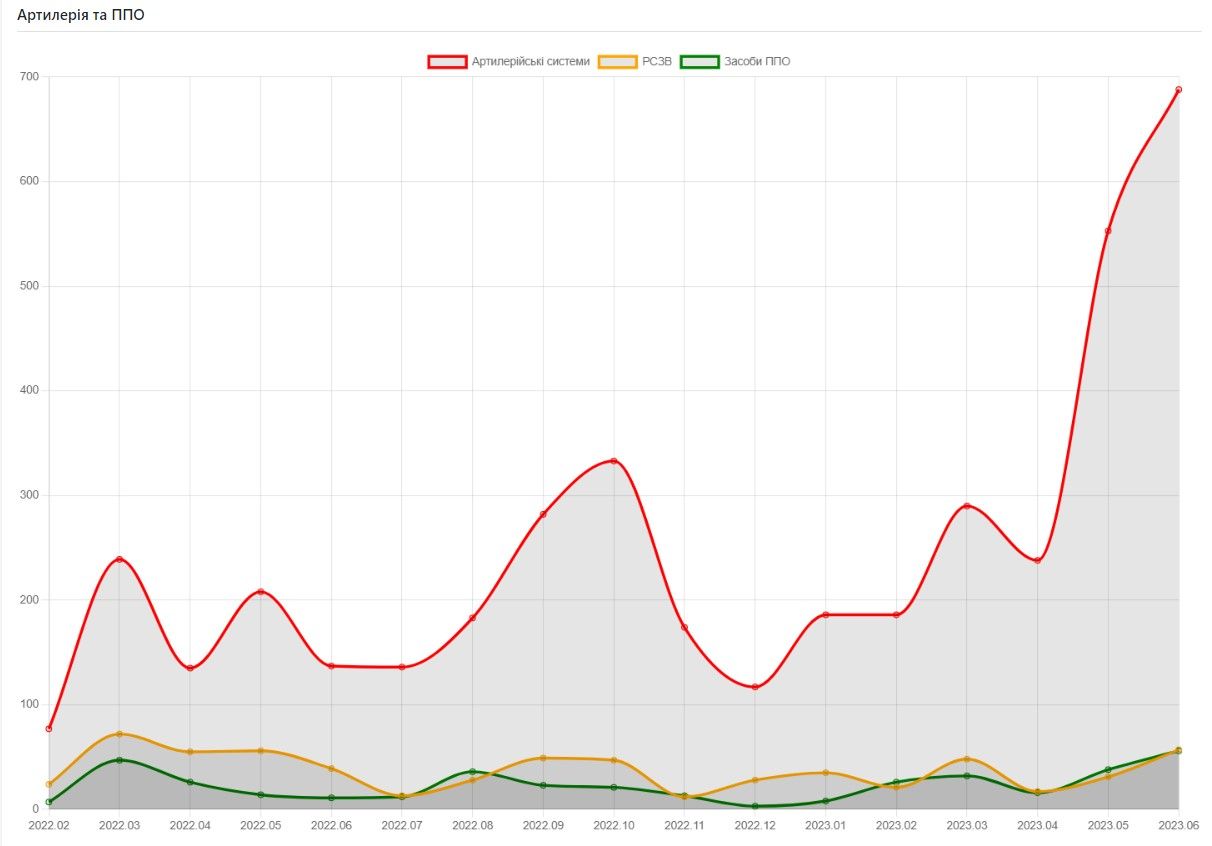 Так, за підрахунками russian-casualties.in.ua, які базуються на даних Генштабу ЗСУ, якщо говорити про втрати загарбників загалом, то за деякими показниками за червень оборонці України побили рекорди. Деякі ж показники – вище середнього.