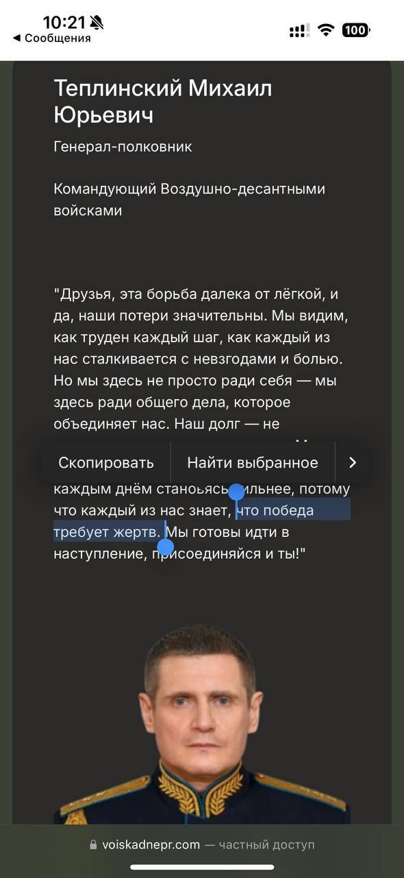 Якщо перейти за посиланням, яке пропонується у повідомленні, то на очі одразу потрапляє цитата командувача угруповання "Днепр" генерала ВДВ Михайла Теплинського. У ній визнаються великі втрати загарбників, і закликають людей приєднуватися та стати наступними "глядачами" на концерті Кобзона.