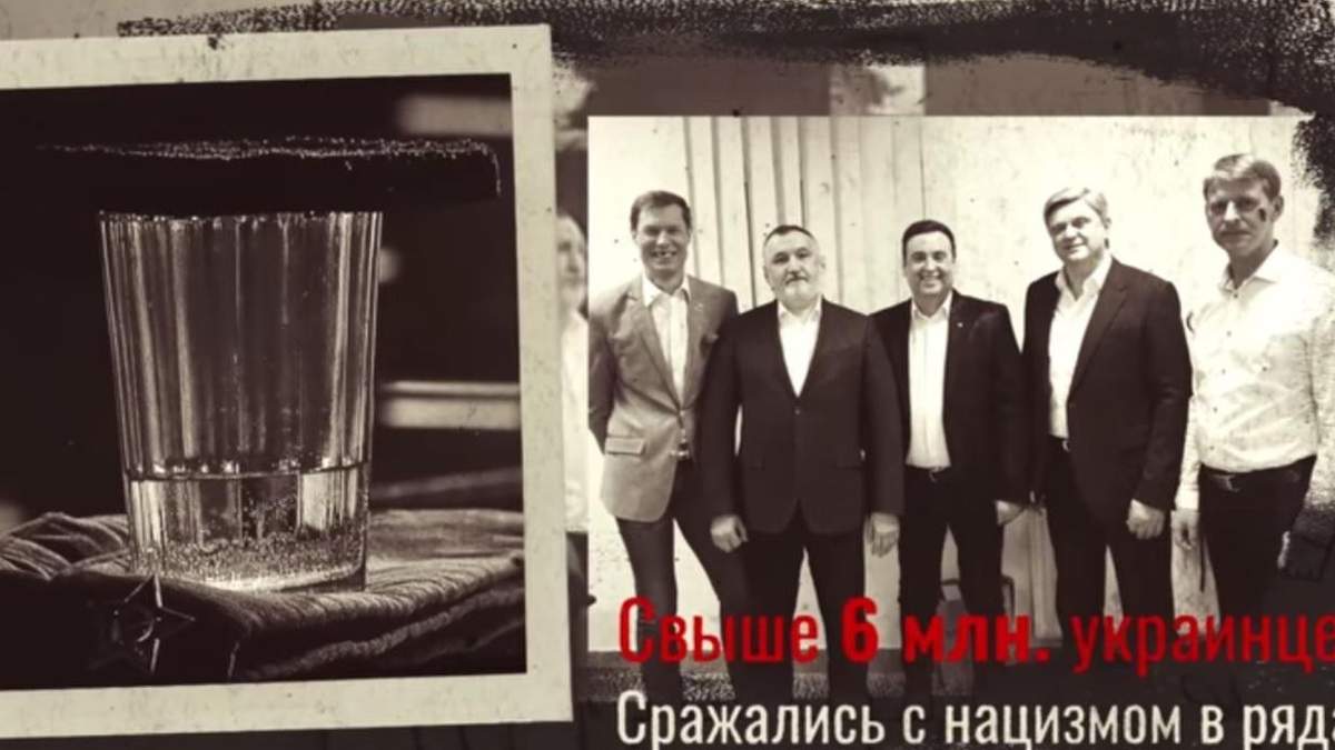 Після слів "пам'ять безсмертна" у відео демонструють порожній гранчак на військовій формі Червоної армії. Поруч – досить неочікуване фото. На світлині зображений сам Кузьмін, ще один нардеп від ОПЗЖ Олександр Качний та… гумористичний дует "Кролики".
