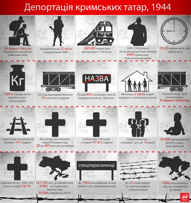 У 1944 році депортація кримських татар почалась через офіційно озвучений привід — співпрацю із німецькими окупантами, державну зраду та звинувачення у "масовому знищення радянських людей". При цьому з півострову виселили і тих, хто дійсно перебував у німецьких підрозділах, і тих, хто воював за радянську армію, і родини тих, хто був відправлений або у сибірські трудові табори, або у Німеччину. У місцях нового проживання з татар робили ворогів, заздалегідь створюючи їм образ зрадників та убивць.