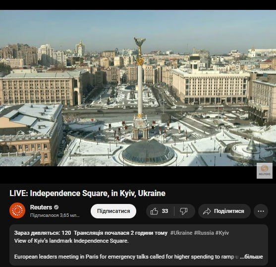 Ройтерз запустив стрім з готелю "Україна". Цікаво, це в надії зняти роботу ППО чи протесту проти угоди з росіянами? Європі стало трішки сумно і хочеться якогось кіна?,