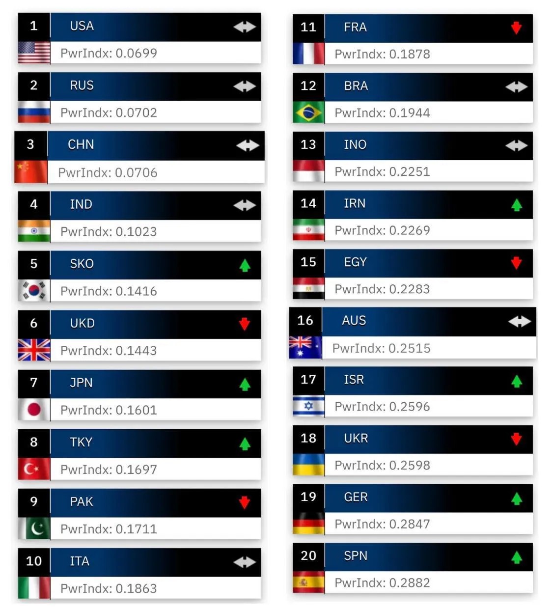 Цього року Україну обігнали Ізраїль, Австралія та Іран. Одразу за ЗСУ розміщуються Збройні Сили Німеччини. Лідерство у світі вже довгий час зберігають військові Сполучених Штатів Америки.