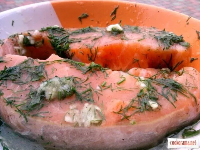 В нашому випадку цією рибою була сьомга. Але це геть непринципово. Чудово підійде і дорадо чи річкова форель, яка по ціні практично ідентична до маринованого шашлику з супермаркету. Брати карпа чи карася теж можна, але тоді рекомендуємо додати трошки зерен коріандру. Головне, щоб риба була не морожена.