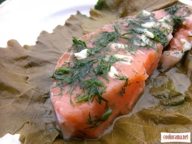 Виноградні листочки заливаємо на пару хвилин кип'ятком і зливаємо воду (щоб стали мякими) або ж якщо маєте, то беремо мариновані листочки. Викладаємо листя, формуючи обгортку для риби.