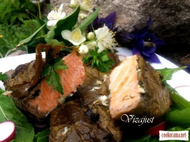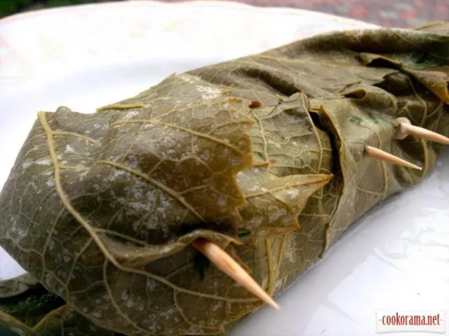 Загортаємо кожне філе у листочки і скріплюємо зубочистками.