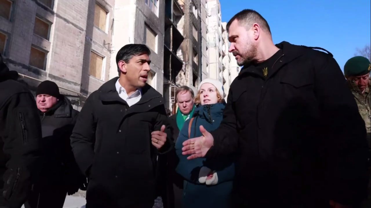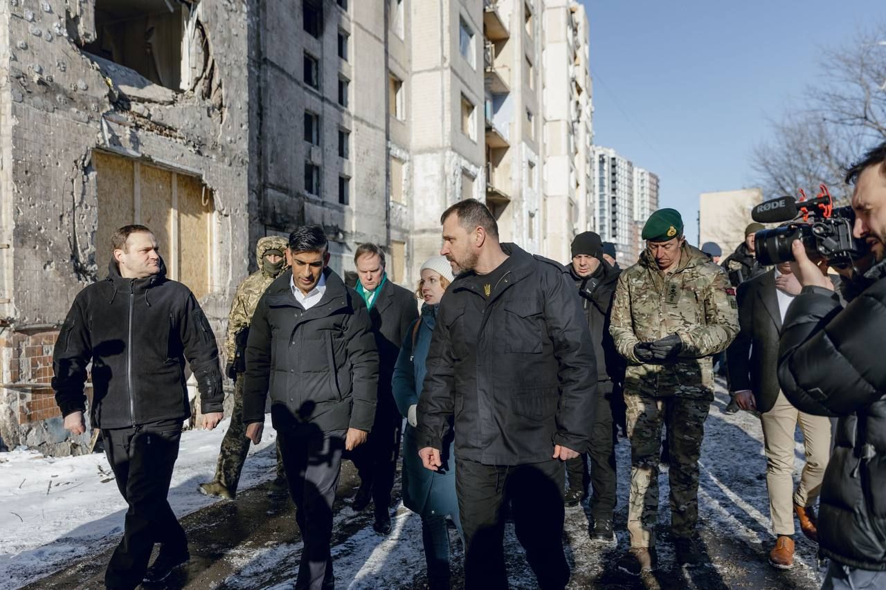 Ріші Сунак біля обстріляного росіянами будинку на Солом'янці в Києві: дивіться відео