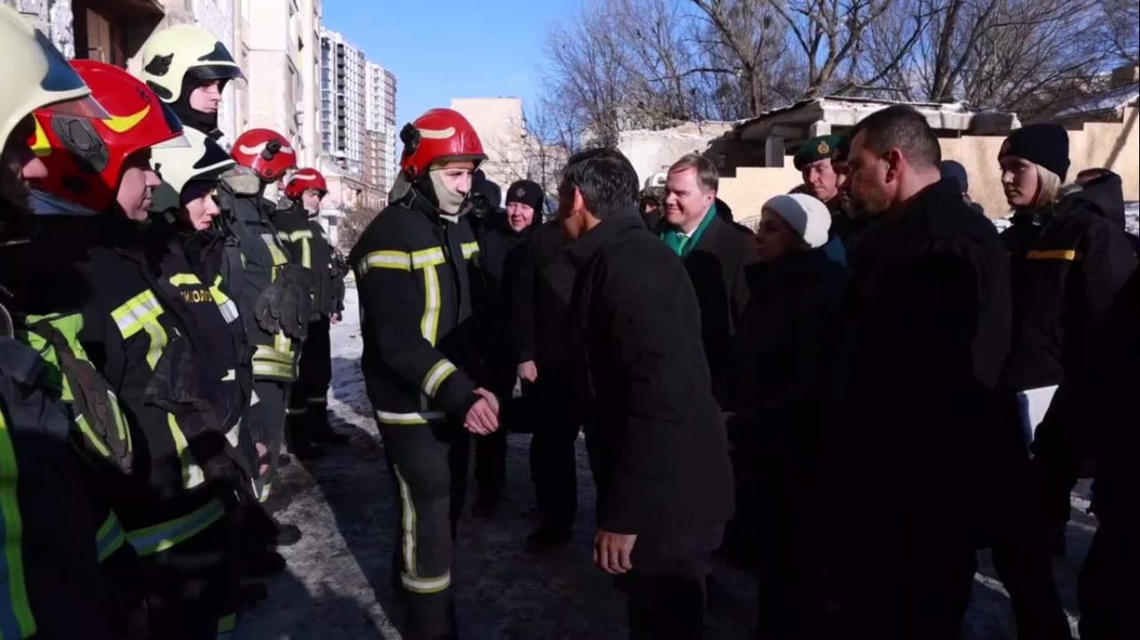 Ріші Сунак дякує рятувальникам ДСНС біля київської багатоповерхівки, обстріляної 2 січня / Фото Олексій Кулеба та скриншоти 24 Каналу