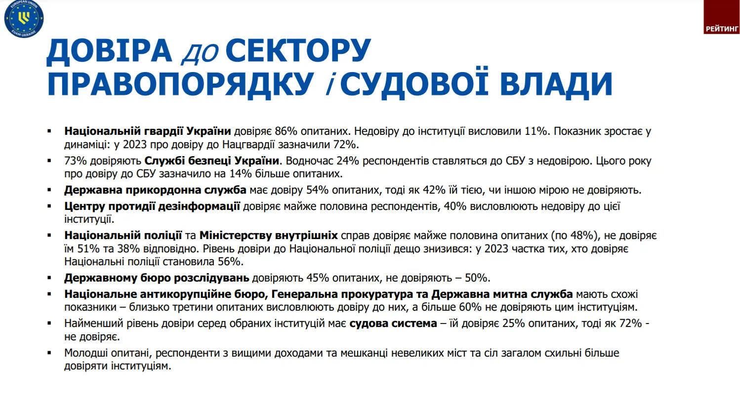 Група "Рейтинг" провела опитування громадської думки на замовлення Євросоюзу. Згідно з результатами, рівень довіри до СБУ сягнув позначки 73% і став найбільшим за весь період незалежності. Водночас Державній прикордонній службі довіряють 54% респондентів, Національній поліції та МВС – по 48%. ДБР отримало рівень довіри 45%, Національне антикорупційне бюро, Генеральна прокуратура та Державна митна служба – близько третини опитаних висловлюють довіру до них. А найнижчі показники довіри група "Рейтинг" зафіксувала до судової влади: лише 25% українців висловили довіру, тоді як 72% – недовіру.