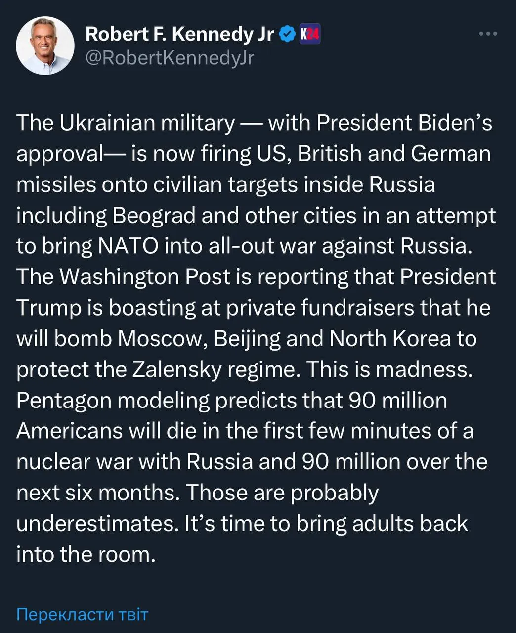 До цього комбо-набору ідіотизму варто окремо додати тваринну ненависть Кеннеді-молодшого до України, бо він просто універсальний поширювач московської пропаганди щодо нашої держави. В різний час він розповідав про американські біолабораторії в Україні та неонацистський режим у Києві, називав російську агресію проксі війною з США, Революцію Гідності – заколотом проти легітимної влади, верещав про етнічні чистки росіян і казав, що Путін напав через Байдена, а Україна "бомбить Бєлград" і займається політичними вбивствами американської еліти.