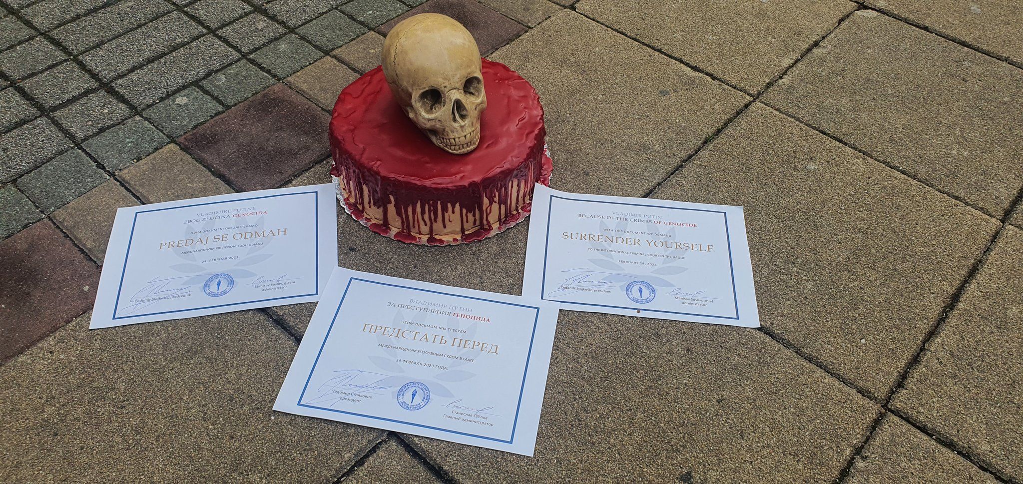 Сьогодні в окупованій Сербії ми принесли послу Росії "торт смерті" і прохання про видачу Владіміра Путіна за злочин геноциду в Україні. Ми знаємо, що смерть – це те, що вони люблять, а люди – це те, що вони їдять, і цей торт – символ їхньої політики,