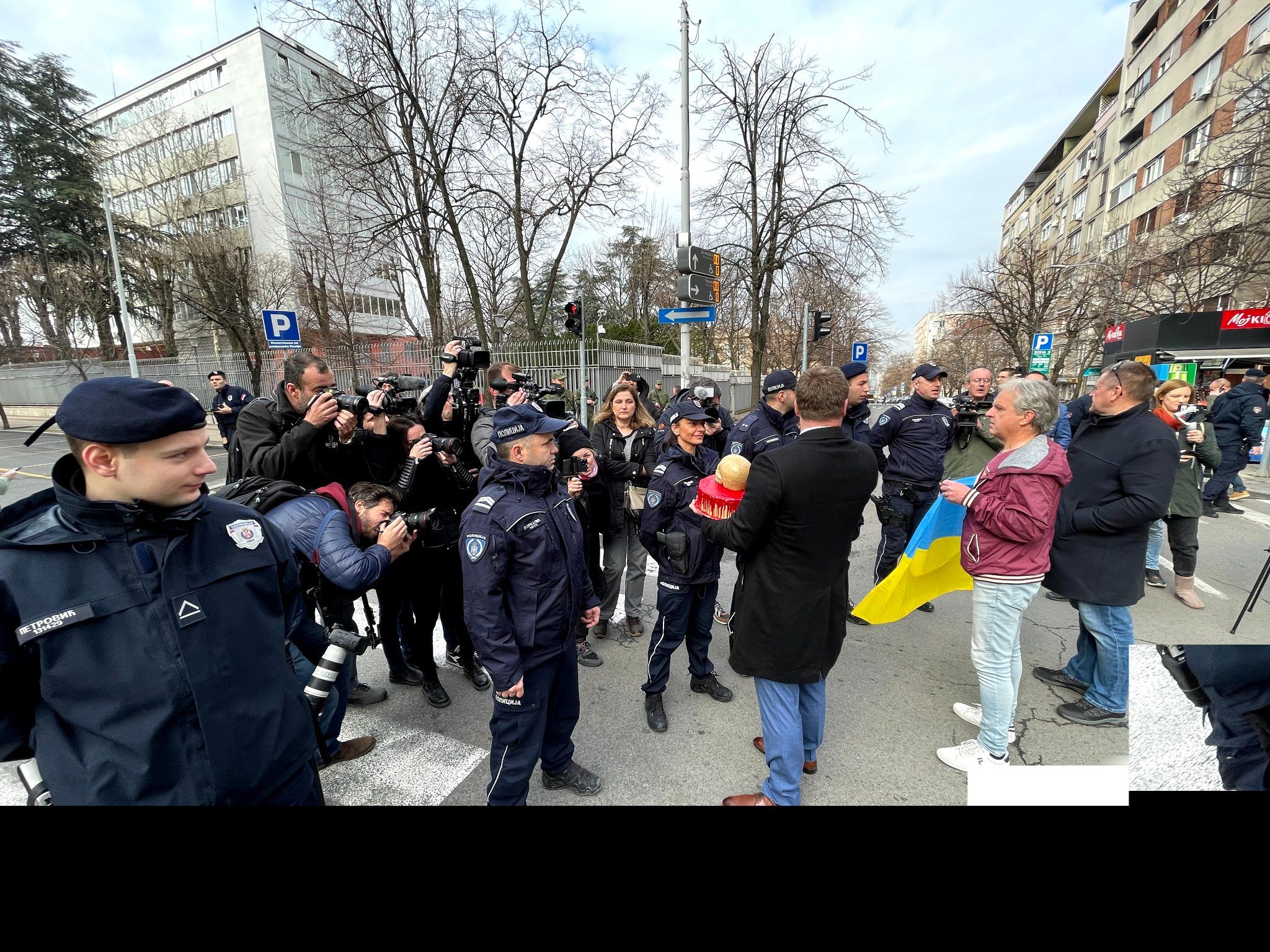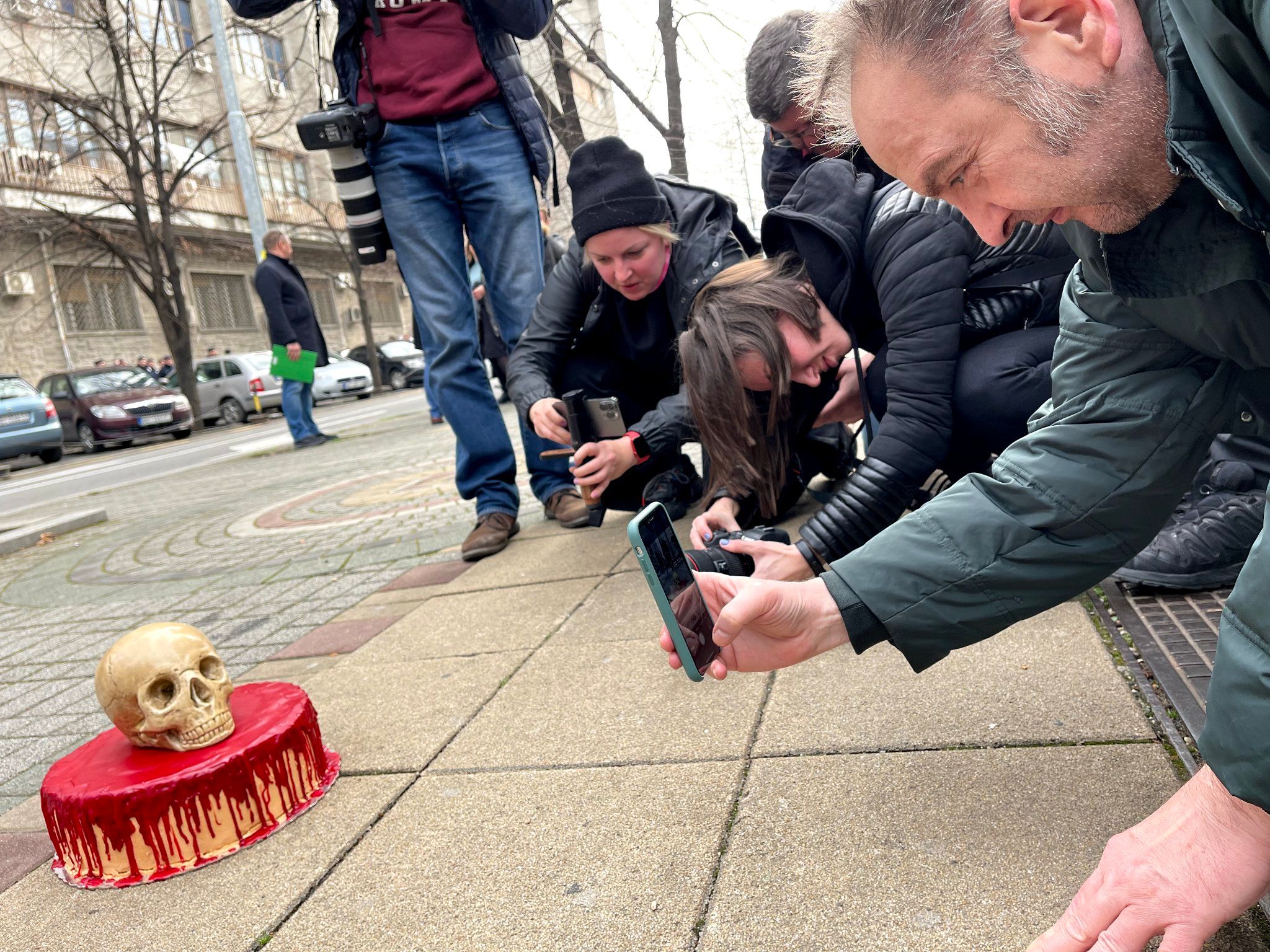 У день річниці російського вторгнення в Україну проукраїнський активіст Чедомир Стойкович прийшов до посольства Росії в Белграді з тортом, увінчаним черепом і прикрашеним так, наче він закривавлений.