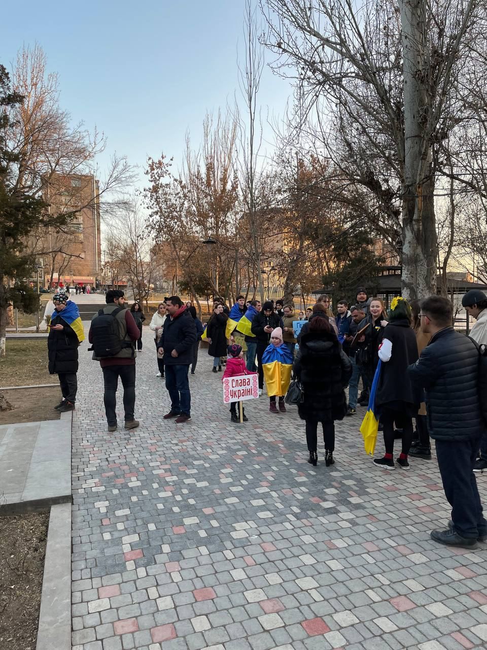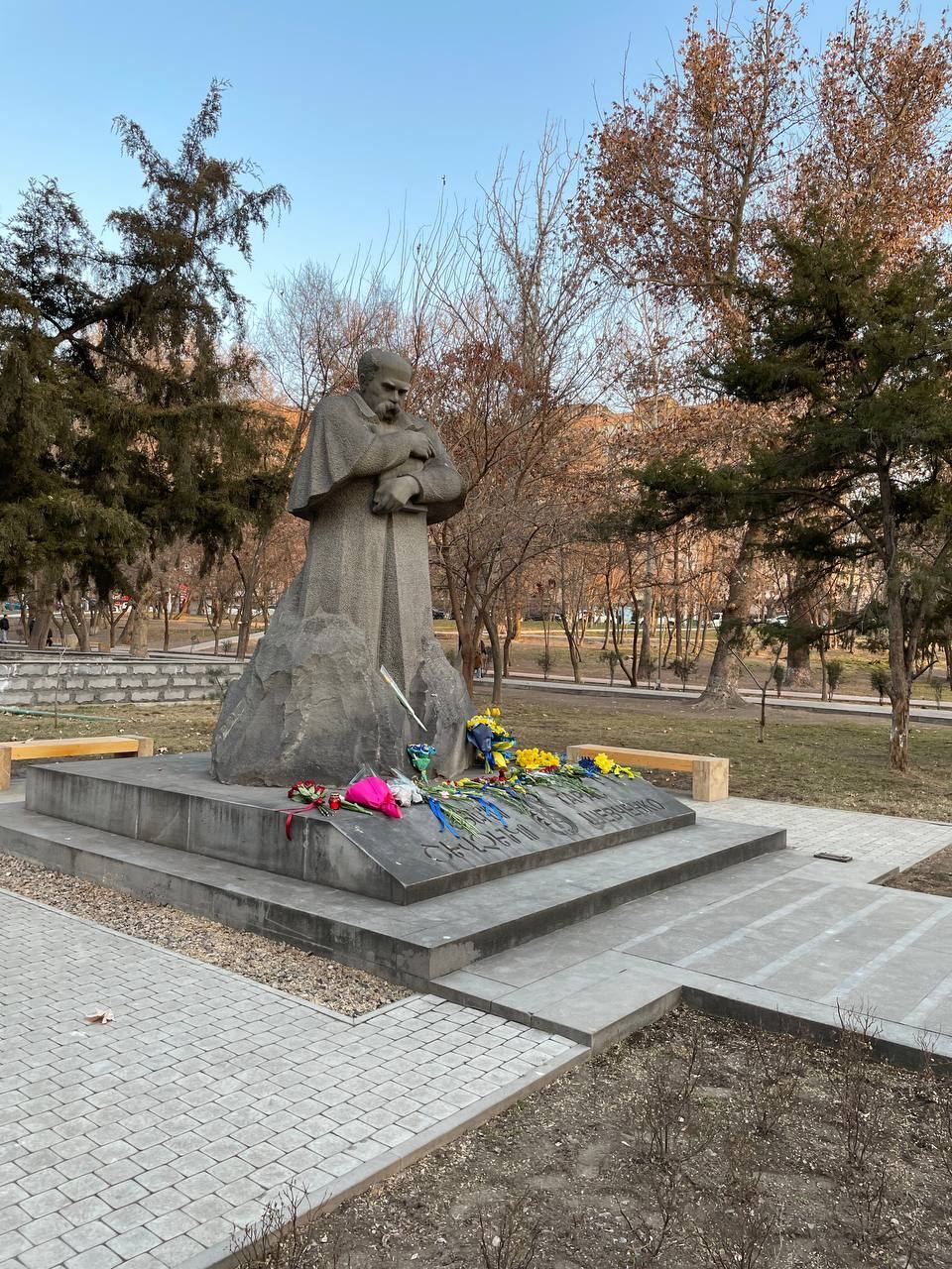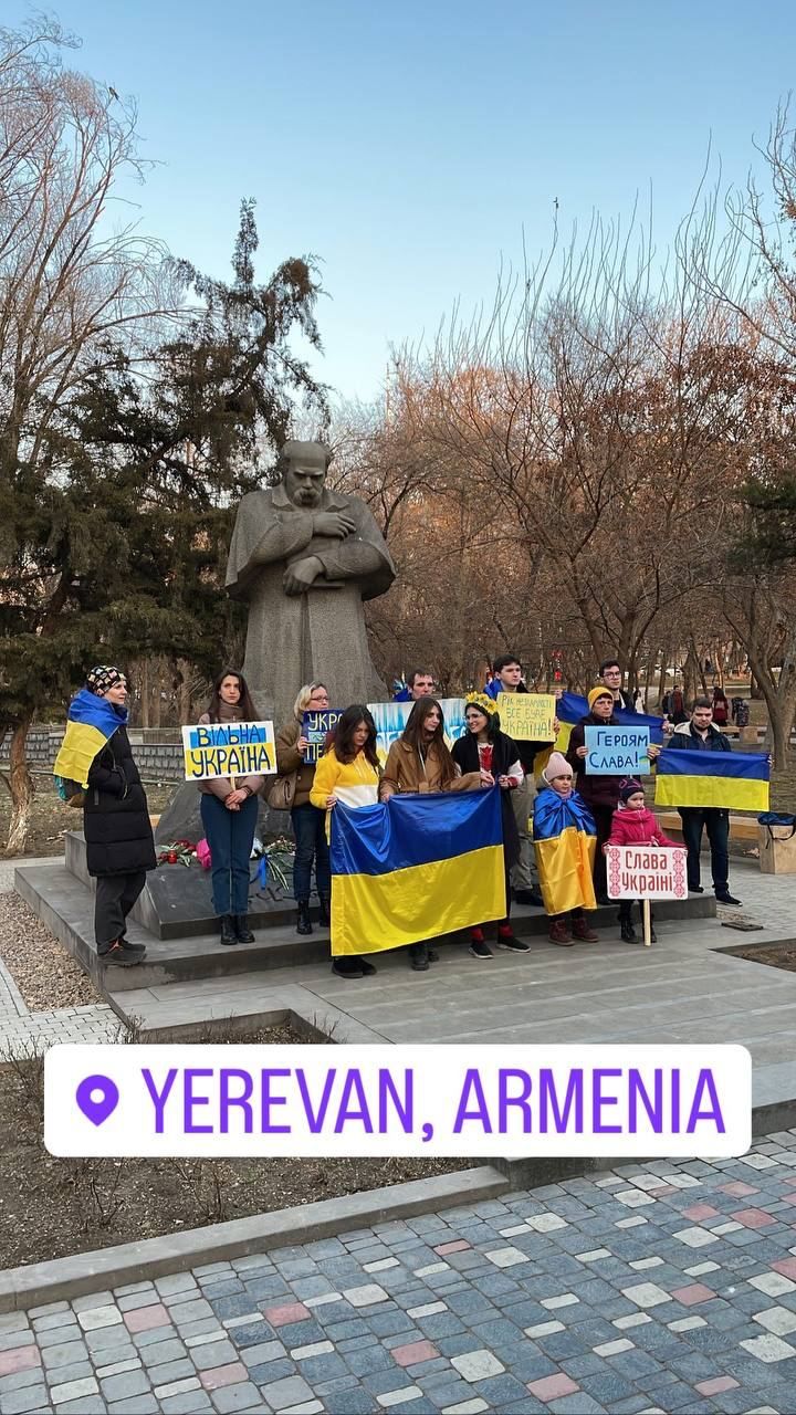 В Єревані 24 лютого також відбулася акція на підтримку України. Люди з прапорами та плакатами прийшли до пам'ятника Тарасу Шевченку.