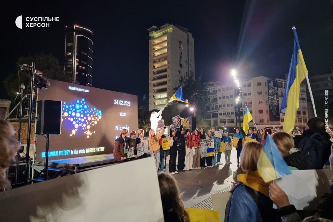 У Нікосії, столиці Кіпру, на площі Свободи понад 500 людей зібрались на мітинг з нагоди річниці масштабного вторгнення Росії в Україну. Серед них – двадцять жителів Херсонської області, які вимушено тікали з дітьми з окупації та від російських обстрілів.