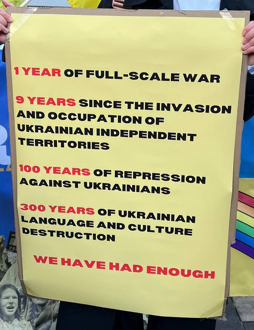 Учасники акції масово несли синьо-блакитні букети до монумента і розгорнули велетенський прапор України. На принесених плакатах можна бачити написи "Путіна геть", "Трибунал для російських воєнних злочинців", "Слава Україні!", "365 днів незламності", плакат зі "Святою Джавеліною" тощо.