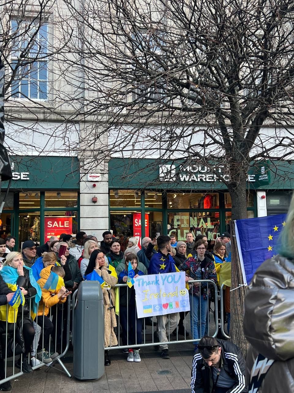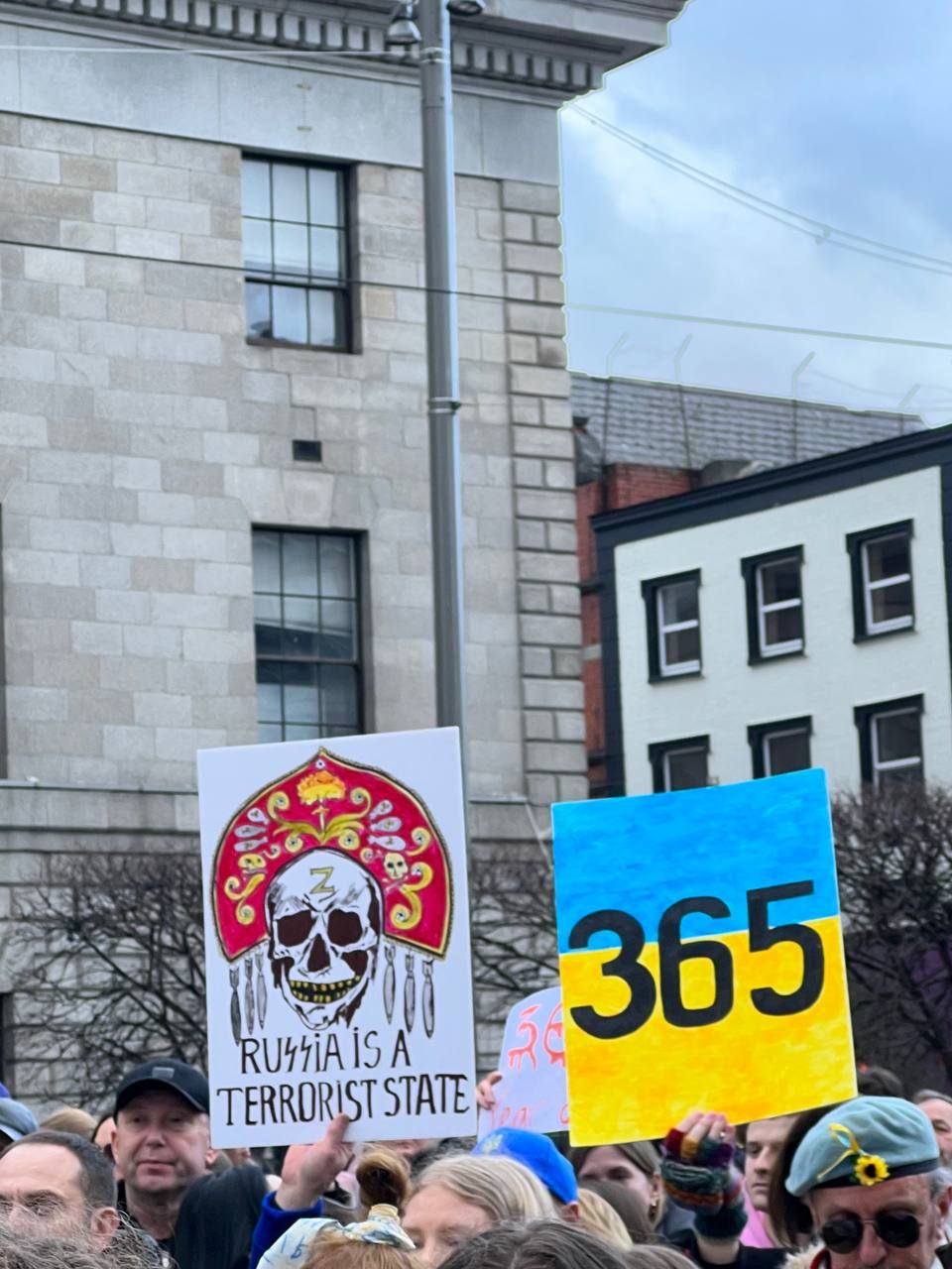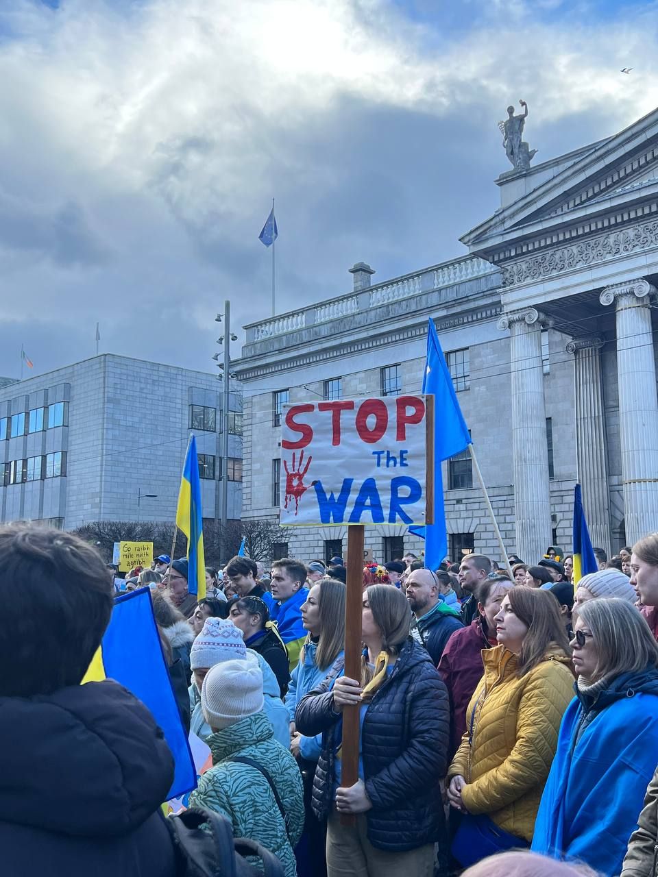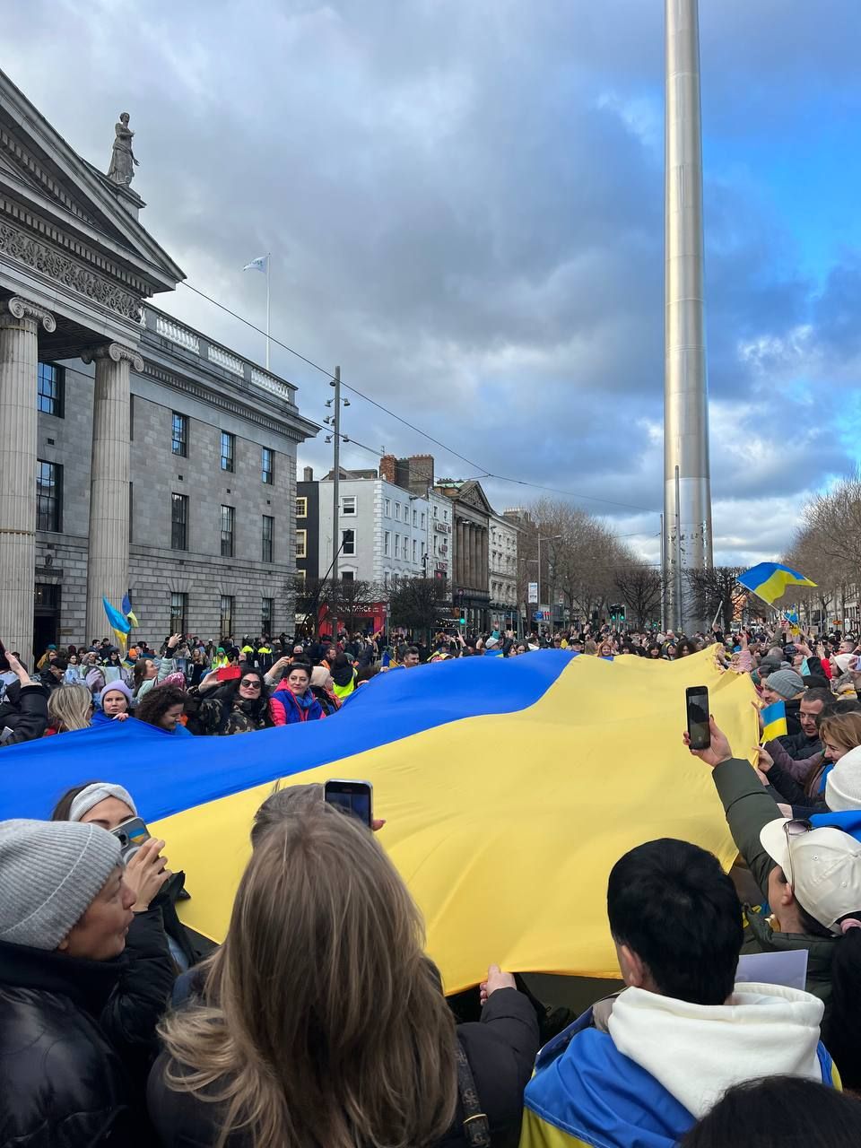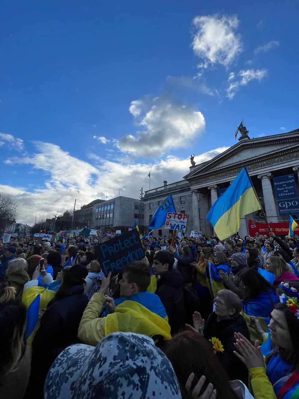 Акцію на підтримку України організували у Дубліні. Сотні людей вийшли на вулицю з українськими прапорами та плакатами проти російської агресії.