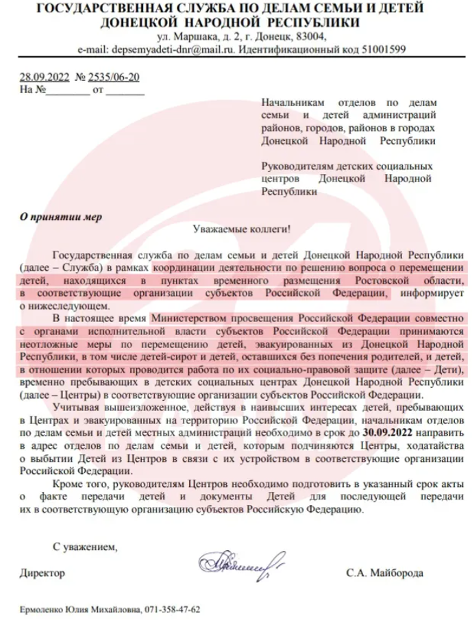 - так званих статусних дітей на Херсонщині, Харківщині та Запоріжжі вивозили примусово згідно з наказами "адміністрації" про евакуацію;