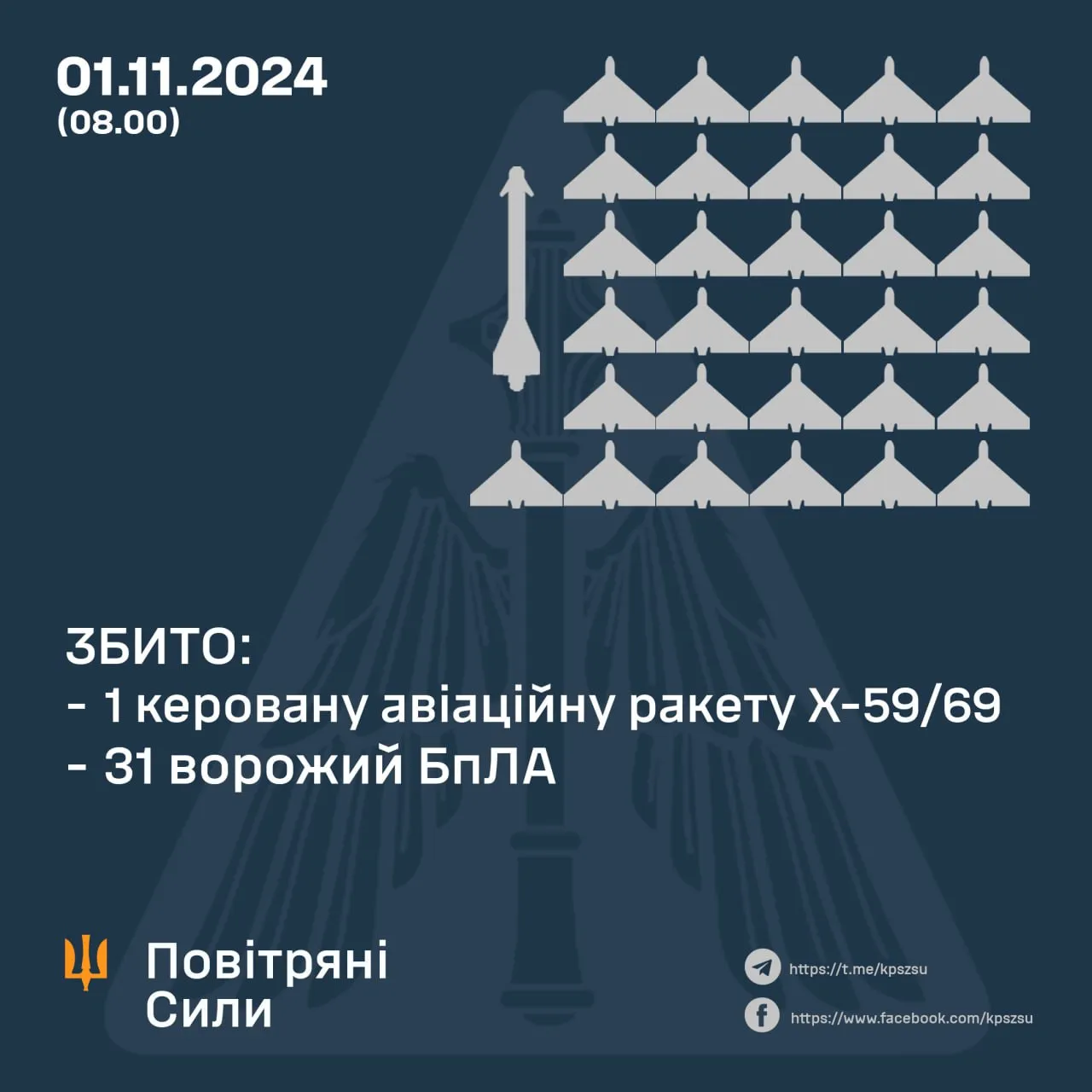 Оборонцям неба внаслідок атаки вдалося збити 31 ворожий БпЛА та 1 ракету Х-59/69. Про це повідомляє 24 Канал із посиланням на повідомлення Повітряних сил ЗСУ.