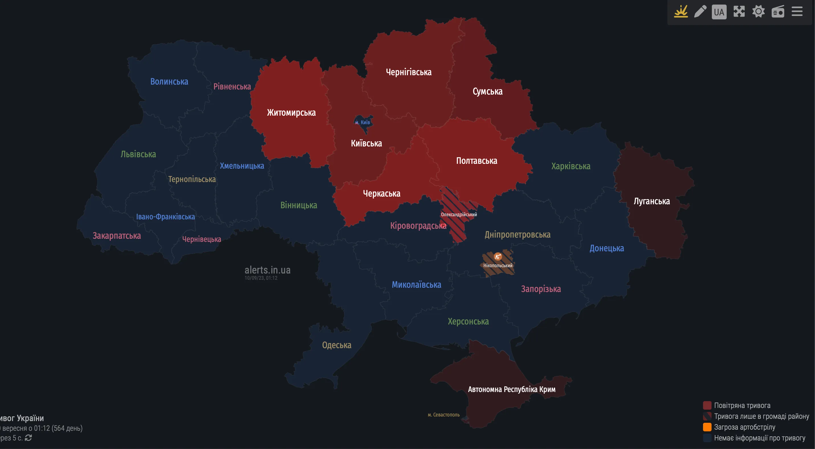 Станом на 00:03 10 вересня дрони-камікадзе наближалися до Київської області з Чернігівщини. А ще через 10 хвилин повідомляли про загрозу для мешканців Полтавщини.