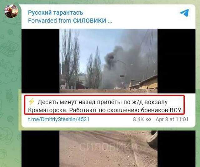 телеграм Олександра Коваленка8 квітня російські окупанти завдали удару ракетним комплексом "Точка-У" по залізничному вокзалу в Краматорську. Траєкторія польоту ракети легко визначається, і вона була з боку окупованих територій.