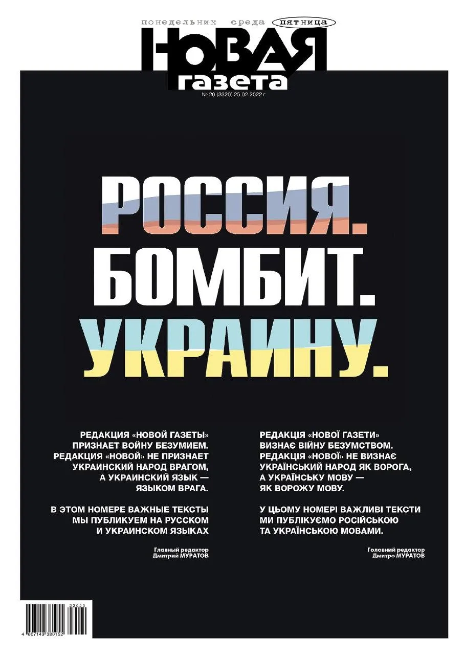 Цей номер "Нової газети" ми випустимо двома мовами – українською та російською. Тому що ми не визнаємо Україну ворогом, а українську мову мовою ворога. І ніколи не визнаємо,